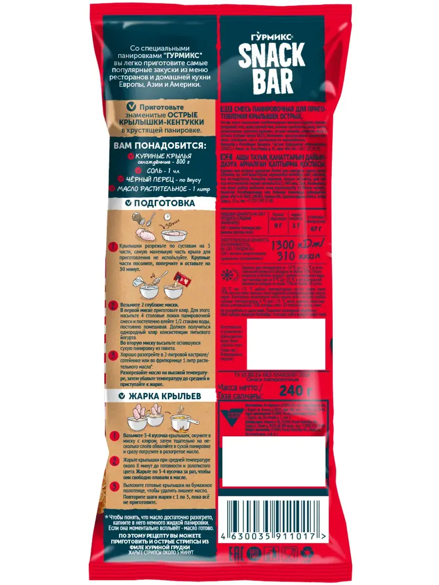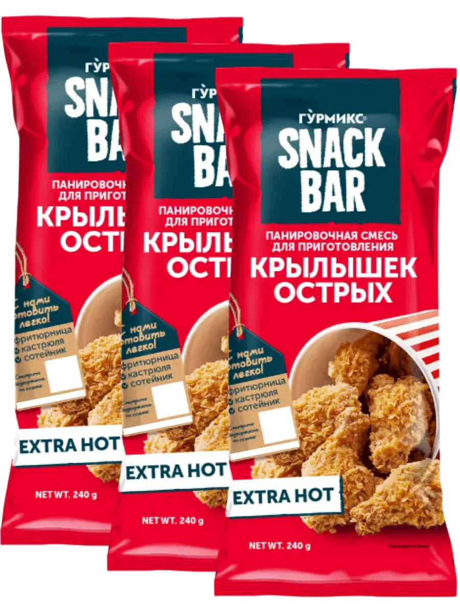 Панированный продукт становится лучше в соединении с хрупкой и хрустящей текстурой панировки, что делает его более вкусным. Панировочная смесь Snack Bar в значительной степени ограничивают утечку воды вместе с растворенными в ней компонентами, отвечающими за аромат, уменьшают убытки массы во время подогрева и хранения, а также обеспечивают очень высокую сочность продукта. Курица хороша в любом виде, но в панировке она получается особенно вкусной и нежной. Представляем уникальную панировочную смесь для приготовления крылышек. В состав приправы входит чеснок и перец чили, которые придают блюду пикантную остроту. На обратной стороне упаковки есть рекомендации по приготовлению острых крыльев. В комплекте 3 пачки по 240г.