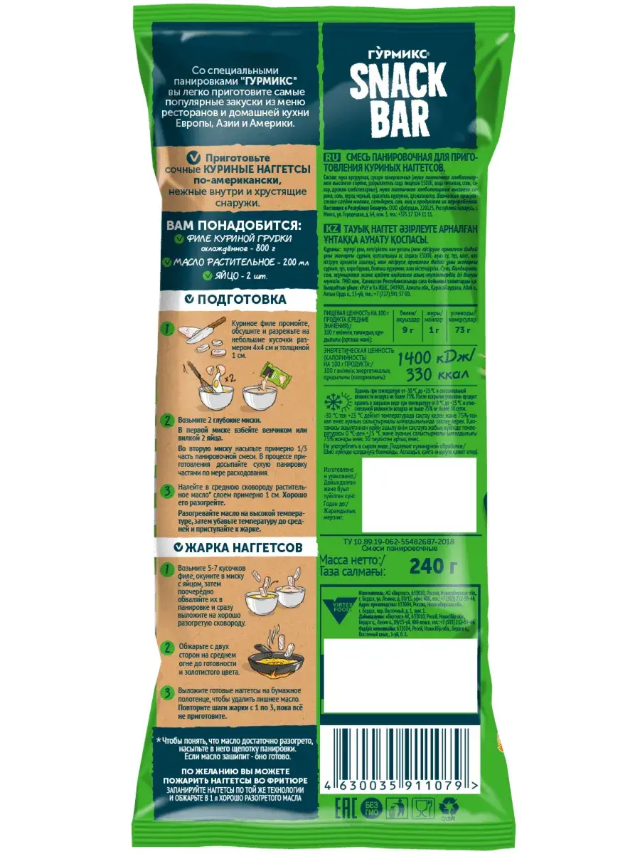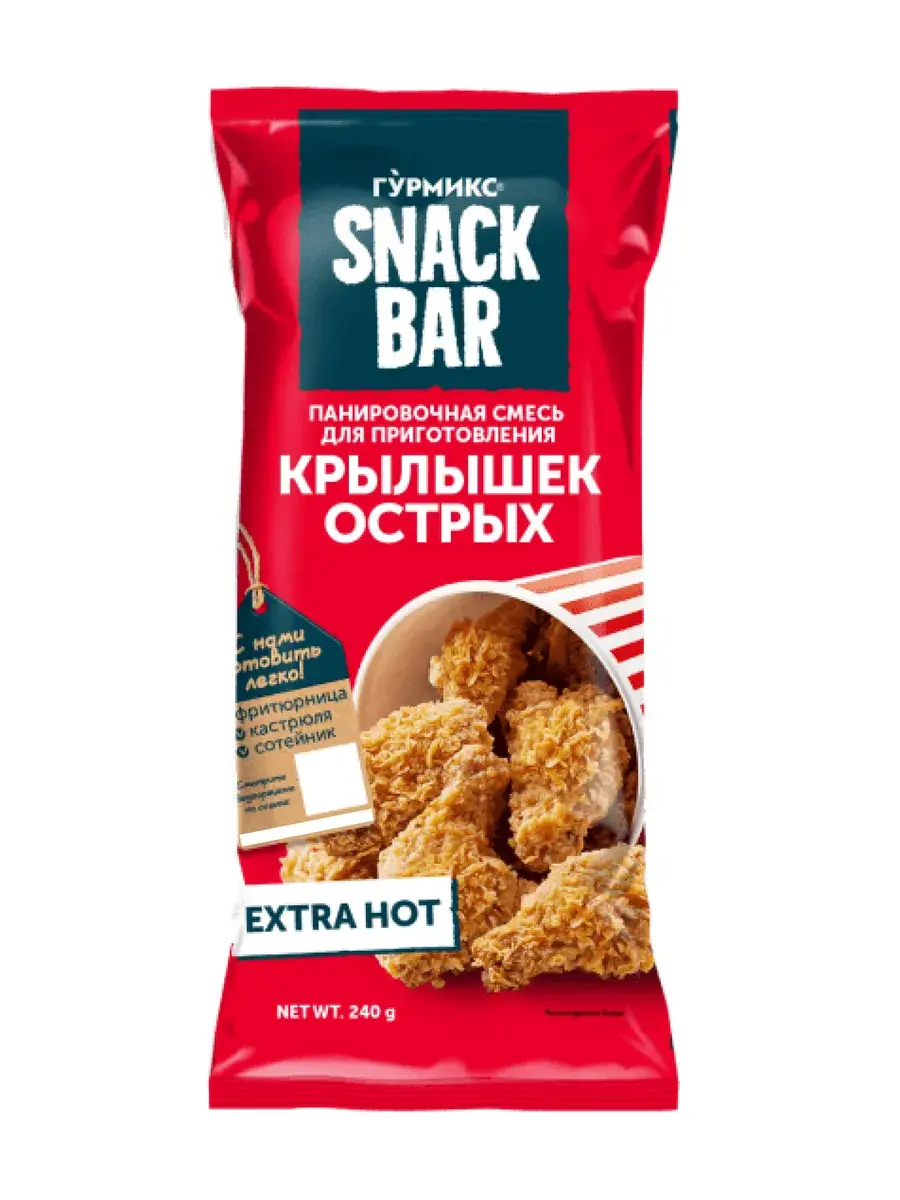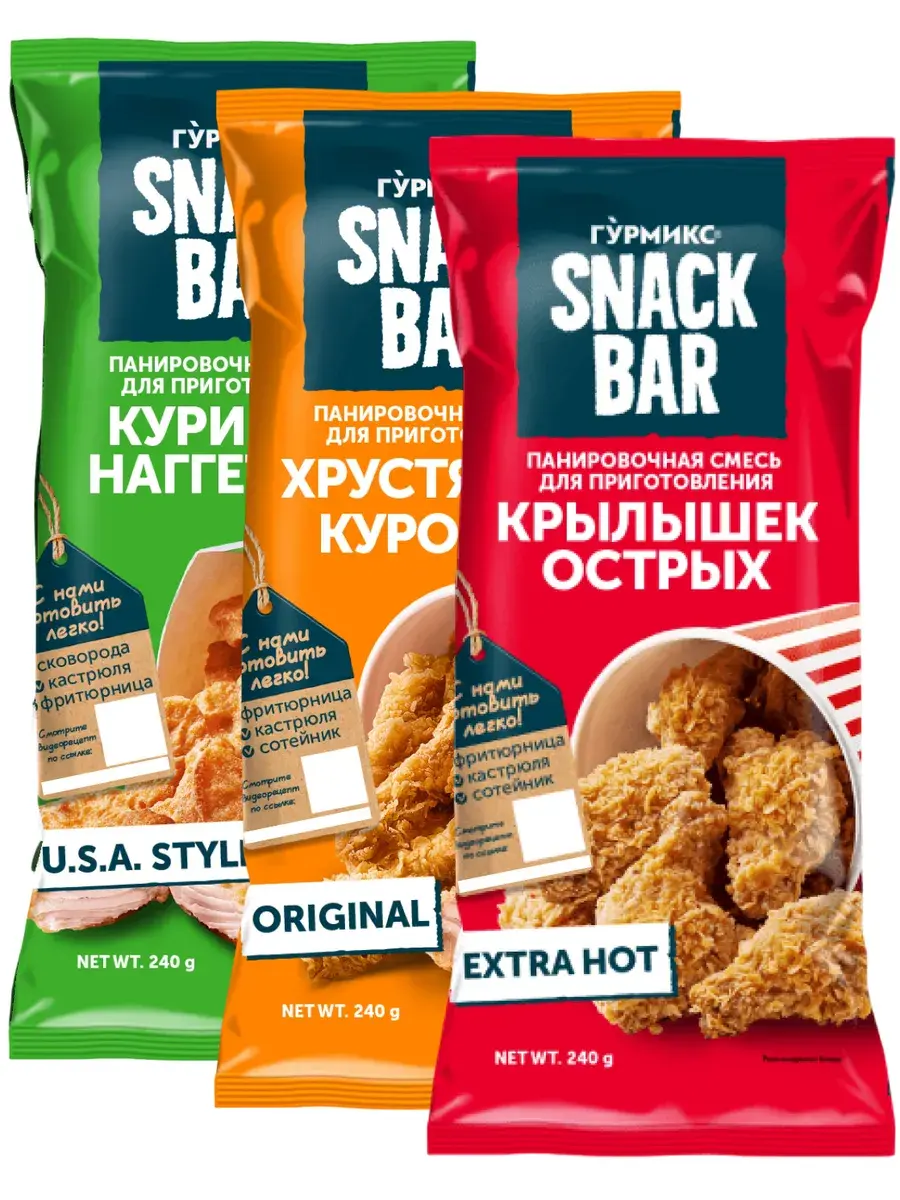 Панированный продукт становится лучше в соединении с хрупкой и хрустящей текстурой панировки, что делает его более вкусным. Панировочная смесь Snack Bar в значительной степени ограничивают утечку воды вместе с растворенными в ней компонентами, отвечающими за аромат, уменьшают убытки массы во время подогрева и хранения, а также обеспечивают очень высокую сочность продукта. Приготовьте сочные куриные наггетсы по-американски, нежные внутри и хрустящие снаружи, оригинальную курочку-Кентуки в хрустящей панировке, полюбившуюся во всем мире, а также острые крылышки. В комплекте 3 пачки по 240г ассорти вкусов.