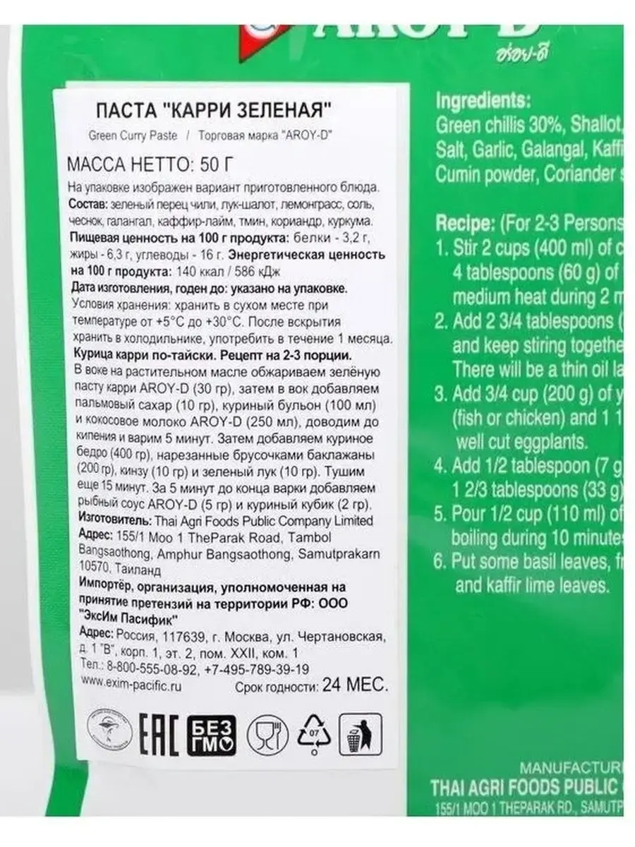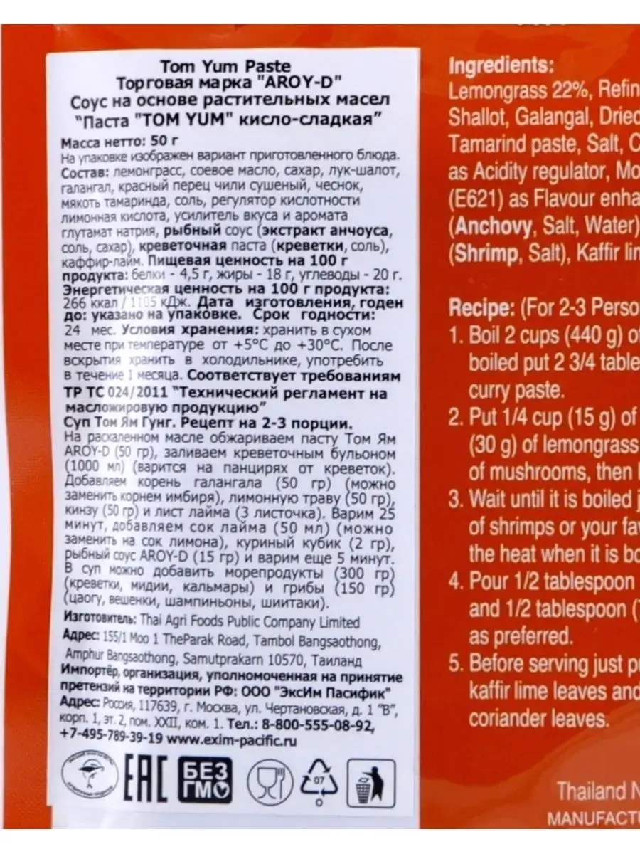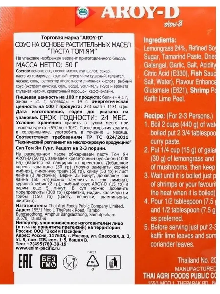 Паста Том Ям AROY-D, 50 г - это основа для самого популярного в мире традиционного тайского супа Том Ям. Ее добавляют в пикантные соусы к мясу, рыбе, пельменям, спринг-роллам, используют в качестве маринада для мяса и рыбы. Пакетик пасты Том Ям 50 гр удобен для разового использования на 1-2 порции.