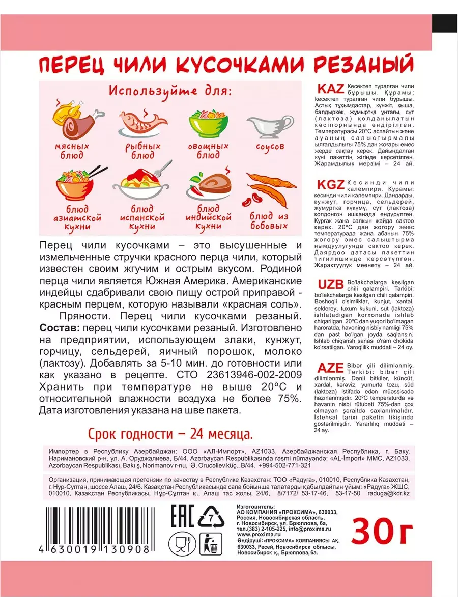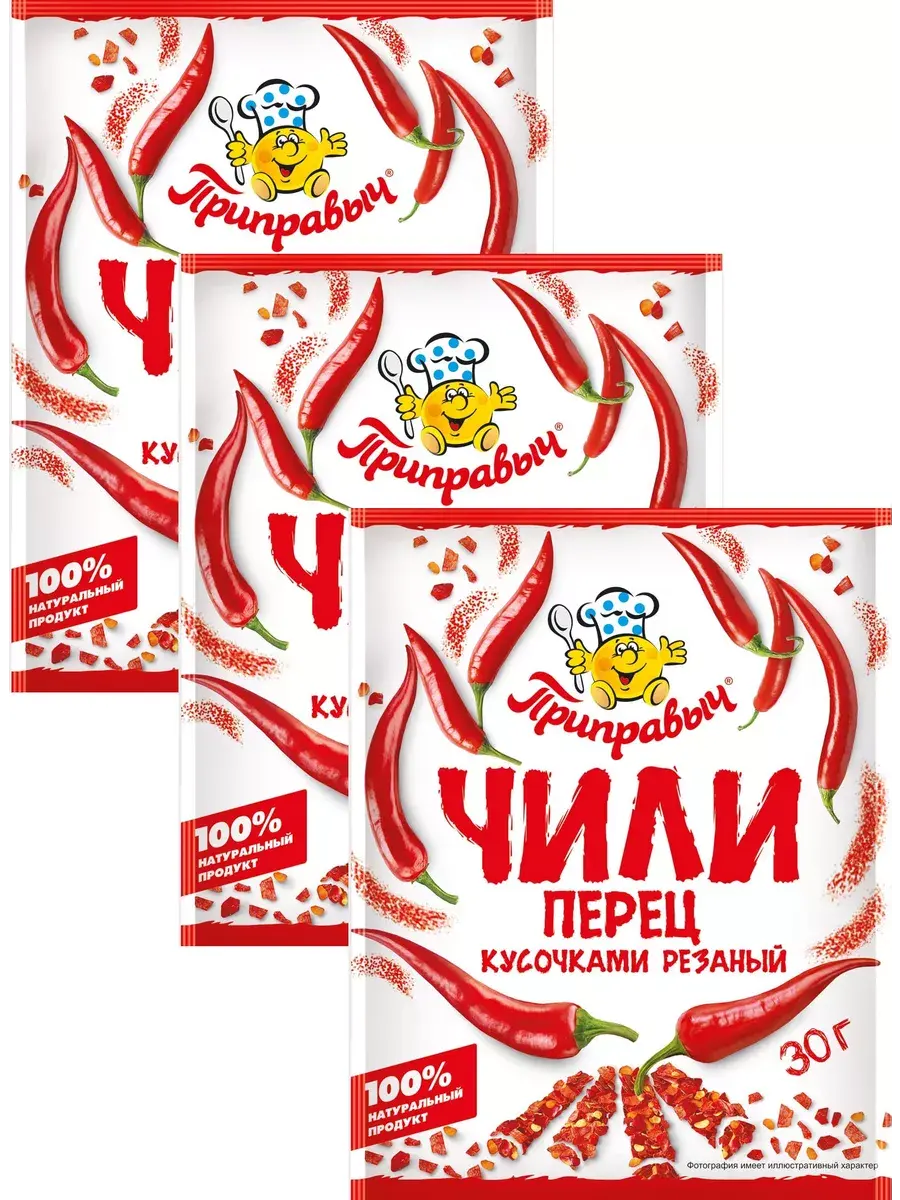 Перец чили кусочками резаный – это высушенные и слегка измельченные стручки красного перца Чили, который известен своим жгучим и острым вкусом. Эта пряность популярна во всем мире! Родиной перца Чили является Южная Америка. Индейцы Америки сдабривали свою пищу острой приправой, которую называли «красная соль». Перец Чили хлопья кладут в качестве приправы для приготовления мясных, рыбных и овощных блюд. Также на его основе изготавливают различные кетчупы, колбасы, соусы, такие как соус табаско или индийский соус. Перец чили активно используется в индиской, азиатской, испанской и многих других кухнях мира! Перец Чили богат углеводами, белками, минеральными солями, питательными веществами и витаминами. Он улучшает пищеварение, укрепляет иммунитет и усиливает аппетит. Также научно подтверждены и другие лечебные свойства этой знаменитой пряности. В комплекте 3 пакетика по 30г.