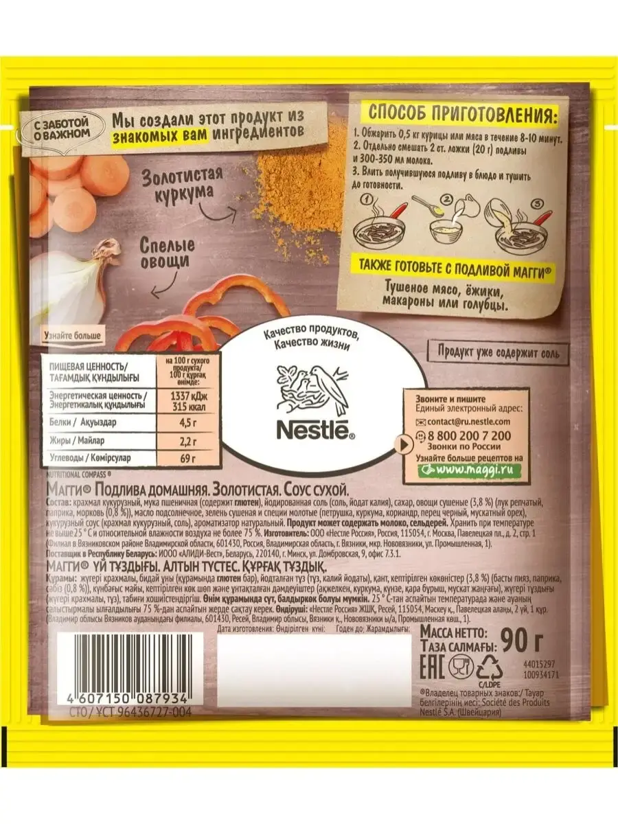 MAGGI Подлива домашняя золотистая универсальна: готовить с ней можно не только тушеную курицу, но и овощи, и мясо и макароны.В составе Подлив MAGGI только известные и понятные ингредиенты.