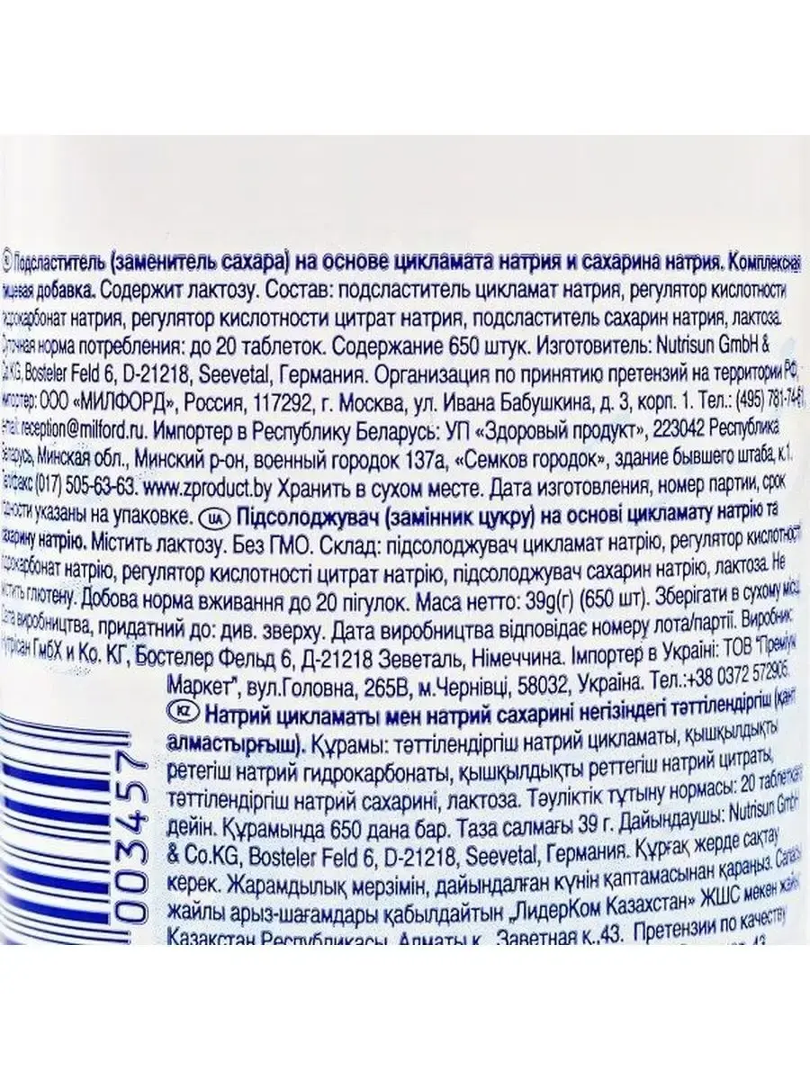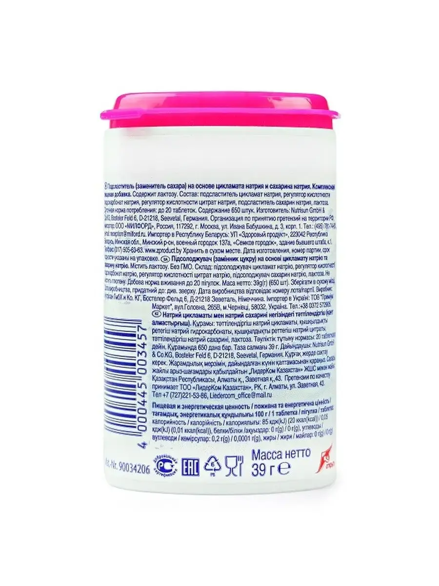 Состав: Подсластитель цикламат натрия, регулятор кислотности гидрокарбонат натрия, регулятор кислотности цитрат натрия, подсластитель сахарин натрия, лактоза.
