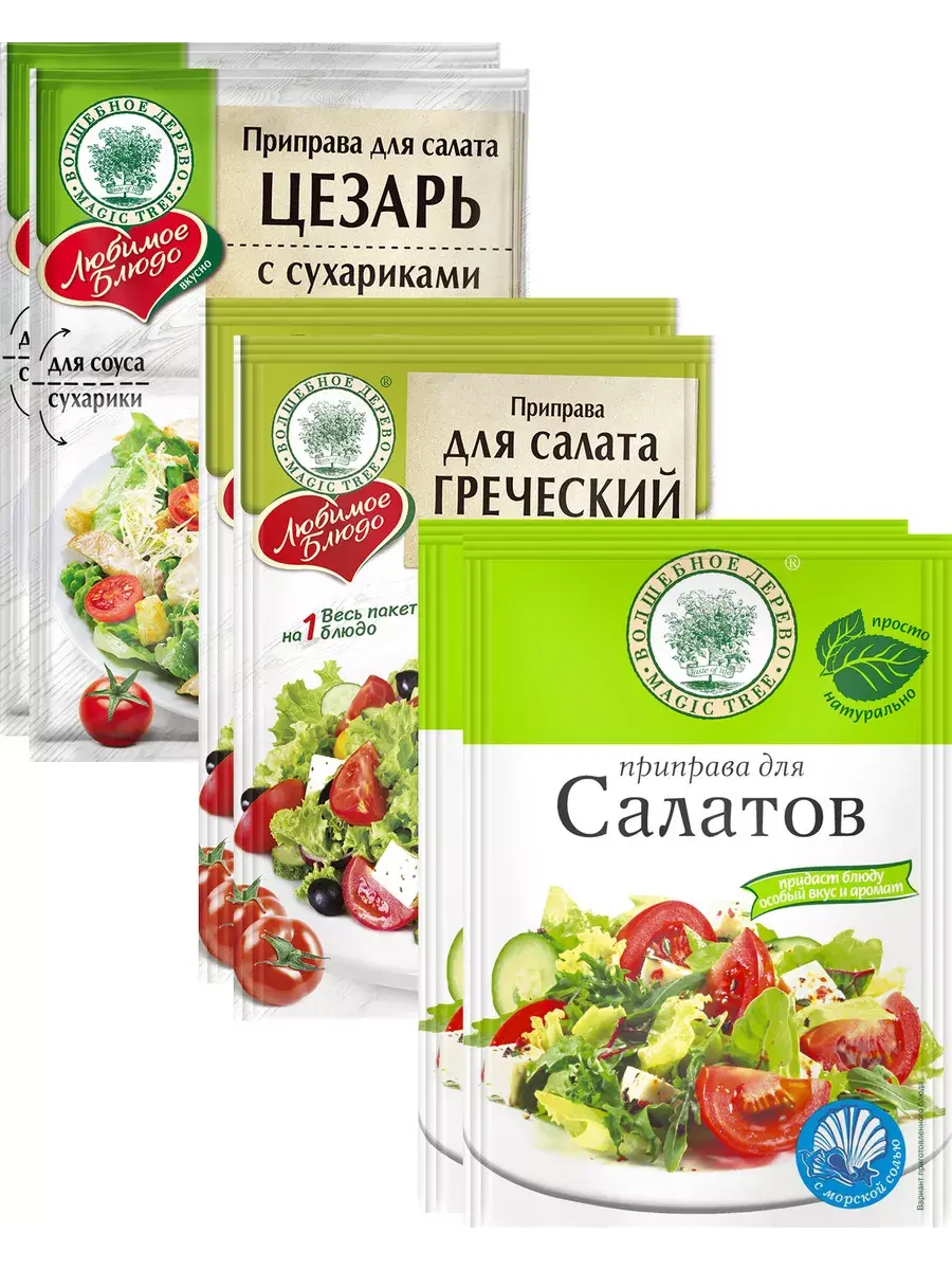 Приправа для салата "Цезарь" состоит из двух отдельных частей: смесь для соуса и сухарики. Чтобы приготовить салат, недостаточно просто приправить его перцем и солью. Неповторимый вкус и оригинальный аромат даёт основа салата - соус, приготовленный из смеси ароматных трав и специй, идеально подобранных по своим вкусовым качествам, которые отлично сочетаются между собой и дополняют друг друга. Завершающим штрихом для салата являются хрустящие сухарики. Насладитесь вкусами средиземноморской кухни — приготовьте греческий салат! Секрет этого блюда в ароматных приправах: чеснок, травы, орегано и морская соль сделают вкус салата ярким. Салат - вкусное и полезное блюдо, а хорошая заправка может сделать его еще лучше! Идеальное сочетание морской соли, чеснока и специй можно долго подбирать самостоятельно или купить приправу для салатов Волшебное дерево, все компоненты которой тщательно подобраны, поэтому вы без труда сможете приготовить вкусную и ароматную заправку за пару минут. В комплекте по 2 пакетика каждого вида.