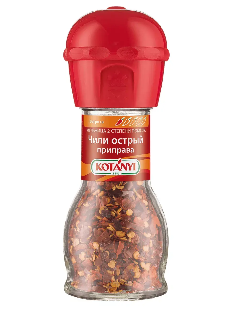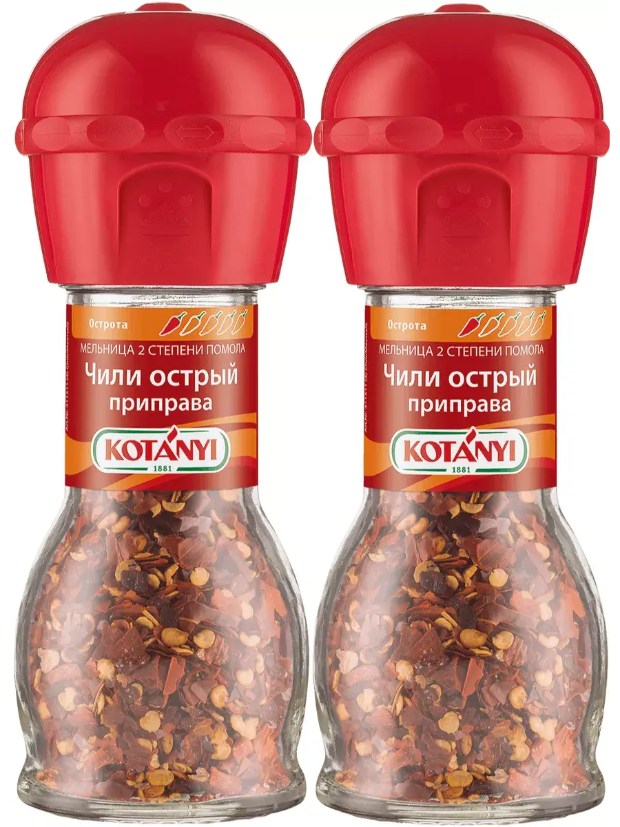 Приправа Чили острый Kotányi придаст пикантную остроту гуляшу, супам, чили кон карне, карри, маринаду для гриля, соусам и пасте. В комплекте 2 мельницы по 35г.
