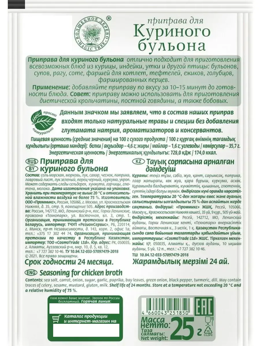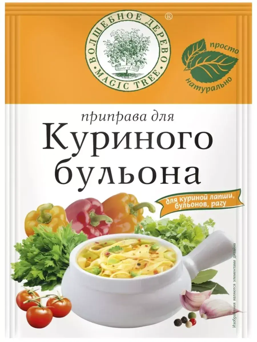 Приправа для куриного бульона "Волшебное Дерево" отлично подходит для приготовления возможных блюд из курицы, утки, индейки или другой птицы: бульонов, супов, рагу и многих других блюд. Насыщенный вкус и яркий аромат придаст изысканности главному блюду. Сочетание черного перца, куркумы и чеснока наполнит бульон традиционными нотками.