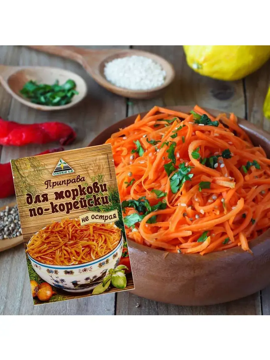 Морковь по-корейски - острая хрустящая закуска из простейших и доступных продуктов. Салат выглядит ярко и аппетитно, длинные и тонкие ломтики моркови блестят от масла и специй. Вкус и аромат моркови по-корейски острой готовой должны соответствовать принятым нормам. Способ приготовления: 1 кг моркови нарезать соломкой, добавить 0,5-1 ст. л. соли, 1 ст. л. сахара. Несколько раз нажать на морковь руками, чтобы начал выделяться сок. Влить 1ст.л. уксуса, перемешать и оставить на 30 минут. Затем, в центре блюда с морковью сделайте небольшое углубление и всыпьте туда «Приправу для корейской моркови». Смешайте и отложите в сторону. Нагрейте масло с чесноком в маленьком ковшике с длинной ручкой, нагревайте его до тех пор, пока чеснок не станет золотистым. Осторожно удалите чеснок из масла, а затем налейте горячее масло в углубление, поверх приправы. Тщательно перемешайте. Оставить на несколько часов при комнатной температуре, а затем убрать в холодильник на 6-12 часов. В комплекте 5 пакетиков по 30г.