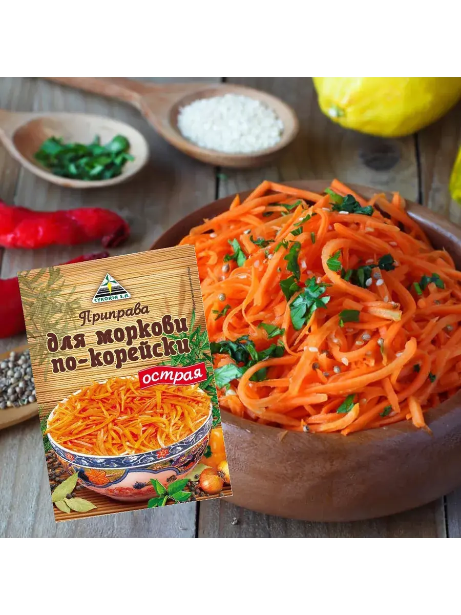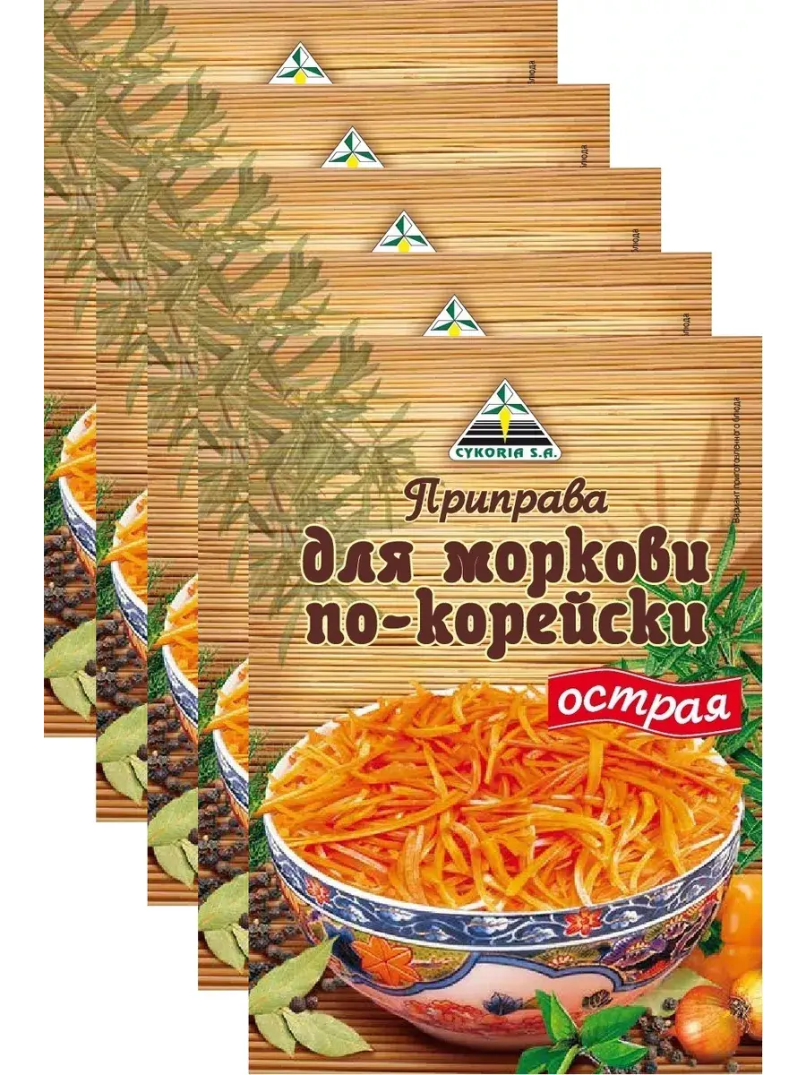 Морковь по-корейски - острая хрустящая закуска из простейших и доступных продуктов. Салат выглядит ярко и аппетитно, длинные и тонкие ломтики моркови блестят от масла и специй. Вкус и аромат моркови по-корейски острой готовой должны соответствовать принятым нормам. Способ приготовления: 1 кг моркови (8-10 средних морковин) нарезать соломкой, посолить по вкусу и оставить на 30 минут. Затем выжать сок и слить его. Добавить в морковь 3 ч. ложки приправы и перемешать. Отдельно взять 100 г подсолнечного масла и 1-1,5 ст. ложки уксуса, смешать, довести до кипения и влить в морковь. Все тщательно перемешать и поставить в холодильник на 2,5 часа. Морковь по-корейски готова! Наш совет: Для получения лучших вкусовых качеств морковь поставить в холодильник на сутки. Содержимое пакета расчитано на 1,5 кг моркови. В комплекте 5 пактеиков по 30г.
