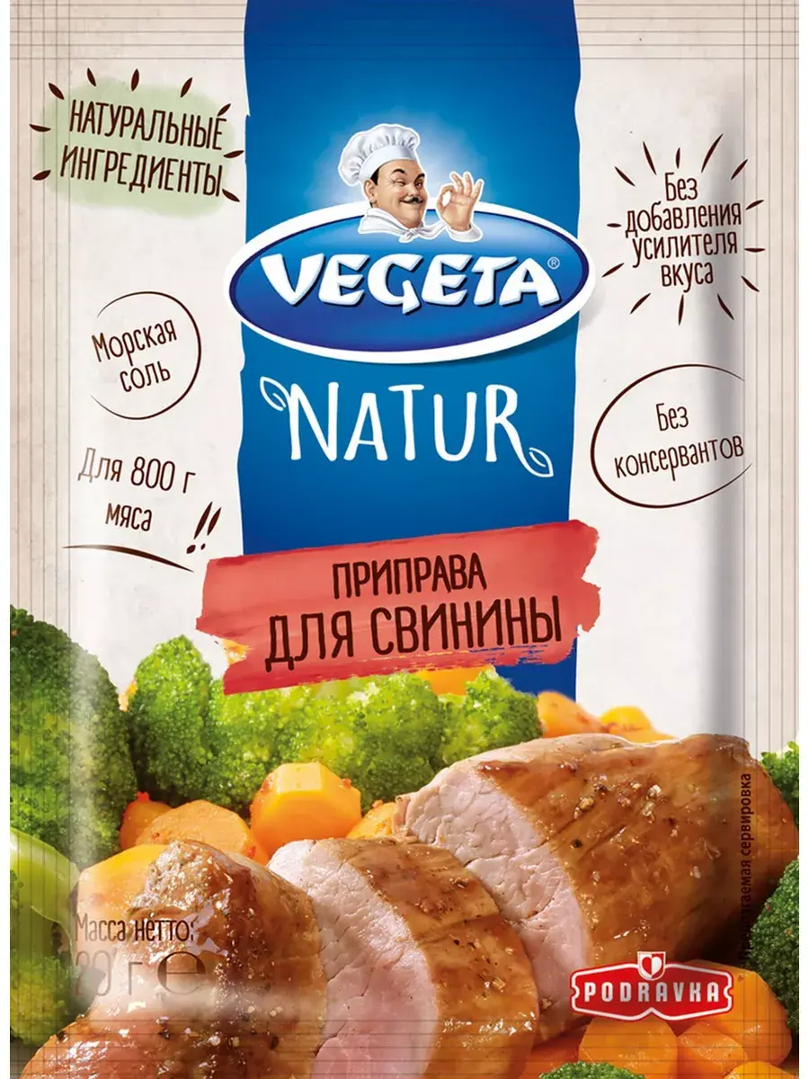 Гармоничное сочетание тщательно подобранных специй, которые содержатся в Vegeta Natur приправе для свинины, идеально подчеркнет, но не заглушит натуральный аромат любимого свиного мяса. Созданная для того, чтобы ускорить процесс маринования мяса, эта приправа облегчает приготовление блюда и позволяет быть уверенным, что вы и ваши близкие смогут насладиться отбивными, шницелями в панировке, с гриля... и все это под девизом: еще сочнее, ароматнее, вкуснее. В комплекте 5 штук по 20г.