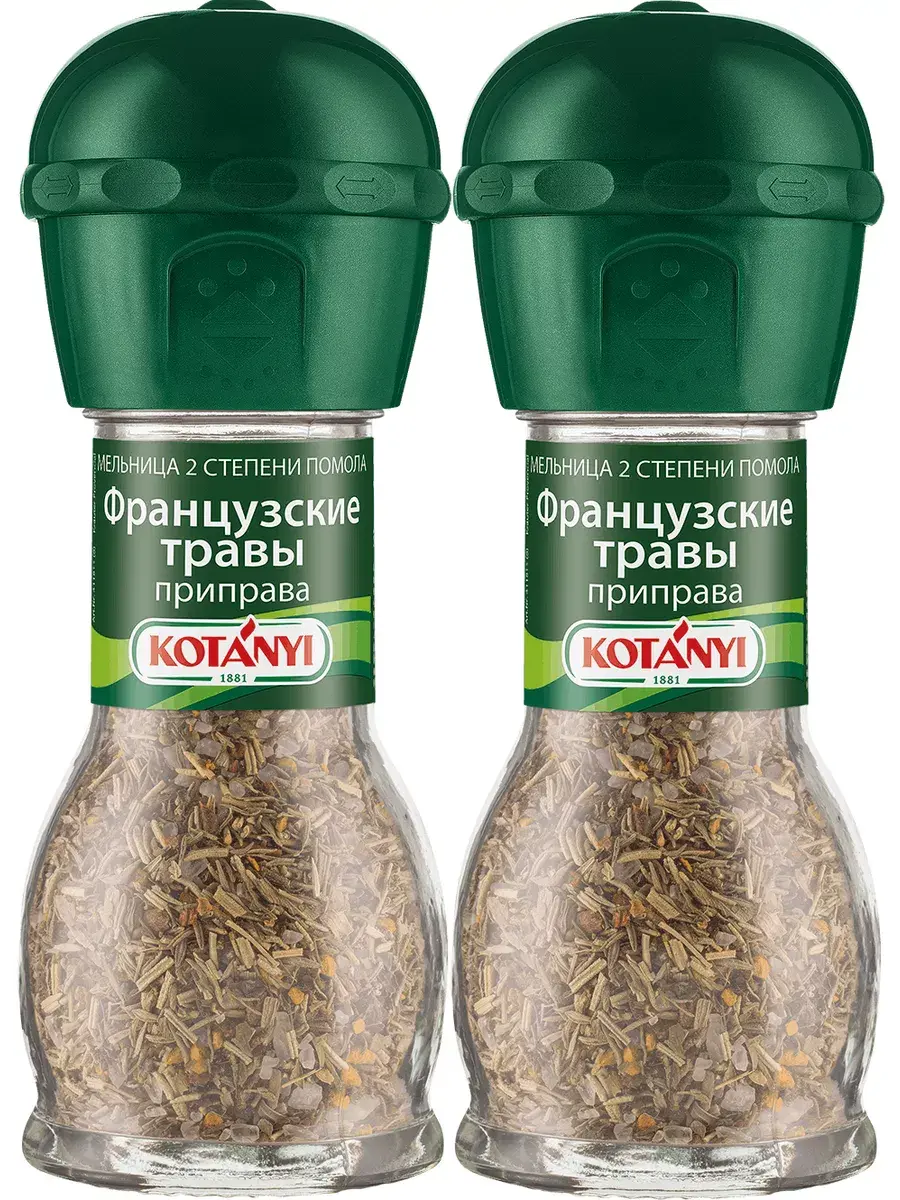 Приправа Французские травы от KOTANYI в мельнице с розмарином, тимьяном, куркумой, морской солью и другими пряностями. Воссоздайте истинный вкус прованской кухни. Приправа Французские травы придаст потрясающий аромат рыбным и мясным блюдам, а также блюдам на гриле, растительному маслу, травяным уксусам и маринадам. С такой удобной мельницей вы сможете по достоинству оценить все преимущества приправы. Пластиковый механизм на крышечке имеет две степени помола. Чтобы выбрать крупный, переверните мельницу и опустите механизм до щелчка. Чтобы использовать мелкий помол, поднимите механизм по стрелочкам. Подходит для сервировки стола. В комплекте 2 мельницы по 33г.