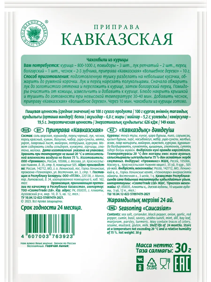 Ароматная палитра пряностей, которая придаст нотки кавказской кухни буквально любому блюду, дополнена морской солью. Сушеные овощи, травы и специи, которые отлично подойдут для маринования и панировки мяса, добавления в плов или аджику или тушеные овощи. Эта приправа станет незаменимой для любителей кавказской кухни. Приправа также отлично подойдет для приготовления не только различных кавказских блюд, но и традиционно европейских. В комплекте 4 штуки по 30г.