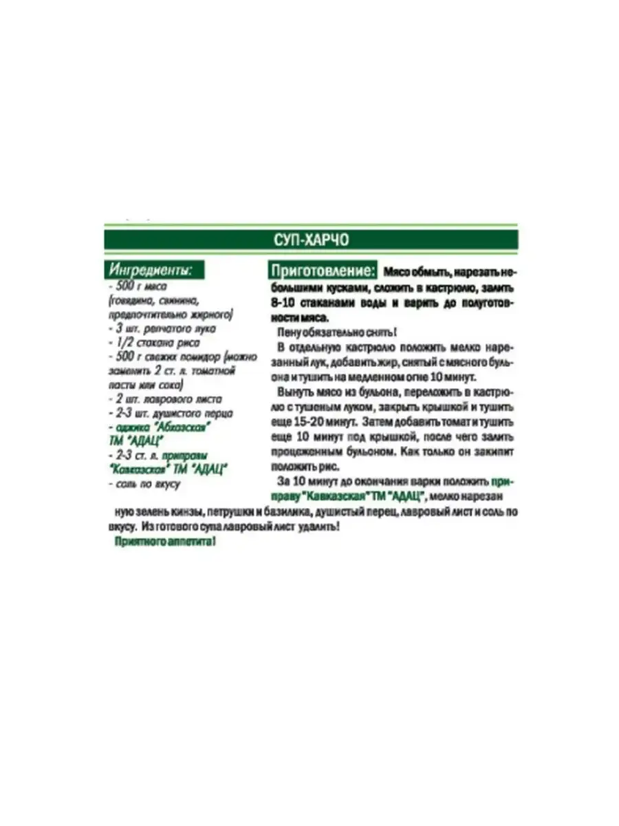 Кавказская приправа является одной из самых известных в мире смесей пряных трав и пряностей. Ее родина — солнечная долина Кавказа. Оригинальная композиция придаст Вашим блюдам неповторимый пряный аромат и вкус. Применяется к мясу, курице, прекрасно гармонирует с гарнирами, овощными блюдами, в соусах и кавказских блюдах: хачапури, шашлык, плов, люля кебаб.
