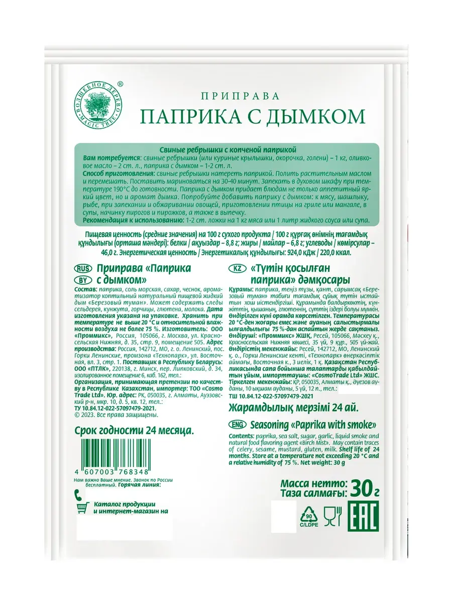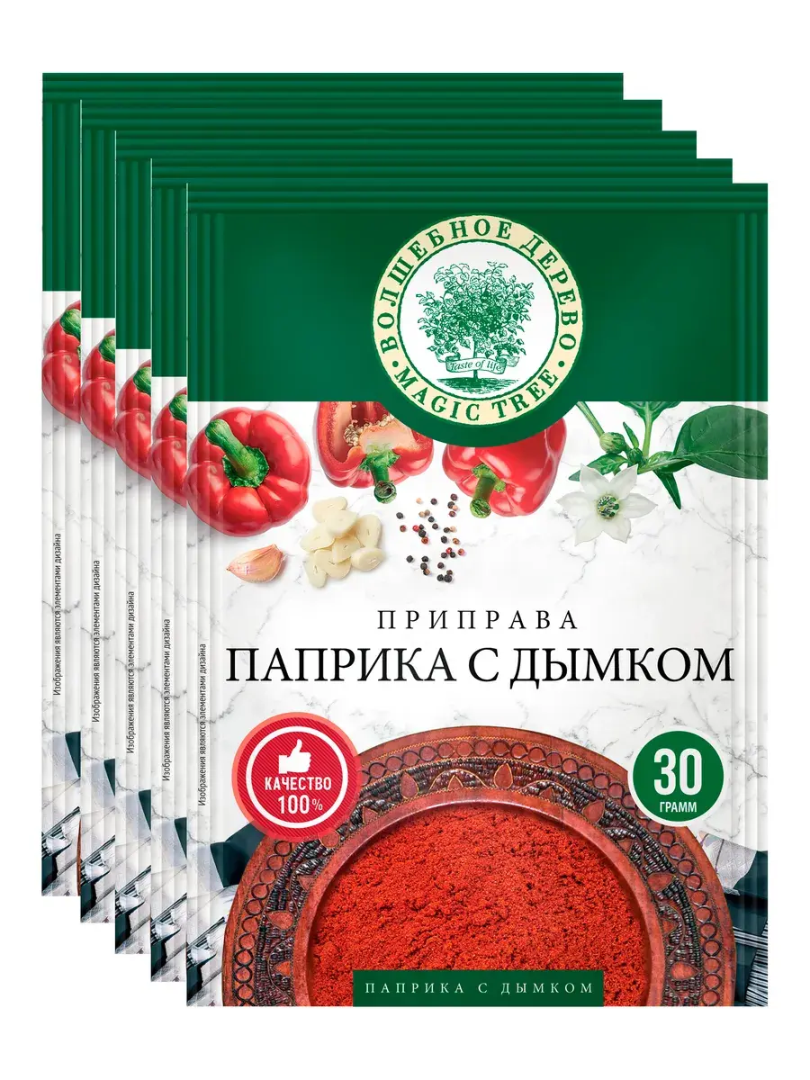 Приправа Паприка с дымком имеет интенсивно пряный сладковатый вкус и аромат костра. Для получения оригинального вкуса и аромата зрелые красные плоды паприки коптятся над дубовыми дровами и перемалываются в порошок. Интенсивный цвет паприки проявляется при смешивании с растительным маслом. Приправа придает сладковато-жгучий вкус блюду, хорошо сочетается с любыми блюдами. Паприку используют во многих кухнях мира. В комплекте 5 штук по 30г.