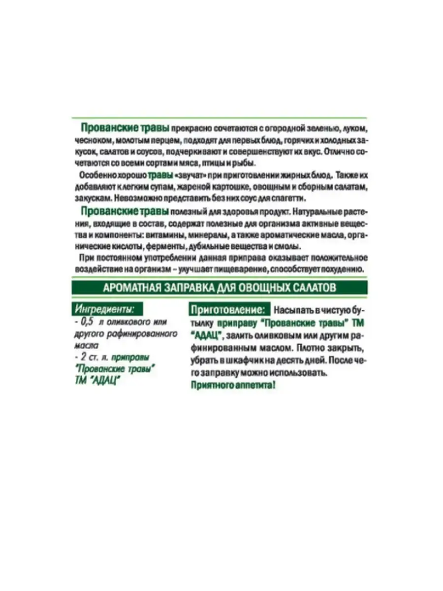 Прованские травы прекрасно сочетаются с огородной зеленью, луком, чесноком, молотым перцем. Подходят для первых блюд, горячих и холодных закусок, салатов и соусов, подчеркивают и совершенствуют их вкус. Отлично сочетаются со всеми сортими мяса, птицы и рыбы.