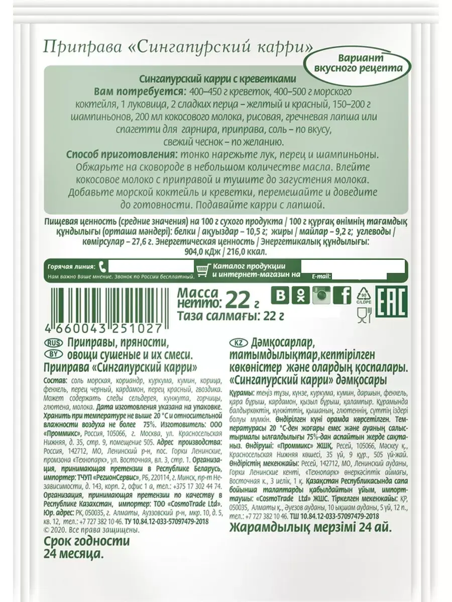Сингапурская кухня – это микс самых разных кухонь мира. При этом сингапурцы невероятно гордятся ею и готовы бесконечно и вдохновенно говорить о еде, показывать и знакомить вас со всем этим многообразием, от которого разбегаются глаза! Такое смешение национальных кухонь делает Сингапур настоящей гастрономической столицей Азии, где можно попробовать блюда почти всех азиатских народов. Приправа "Сингапурский Карри" подойдет для супов, блюд из морепродуктов, рыбы, овощей. На обороте упаковки проверенный рецепт – оригинального блюда. В комплекте 4 штуки по 22г.