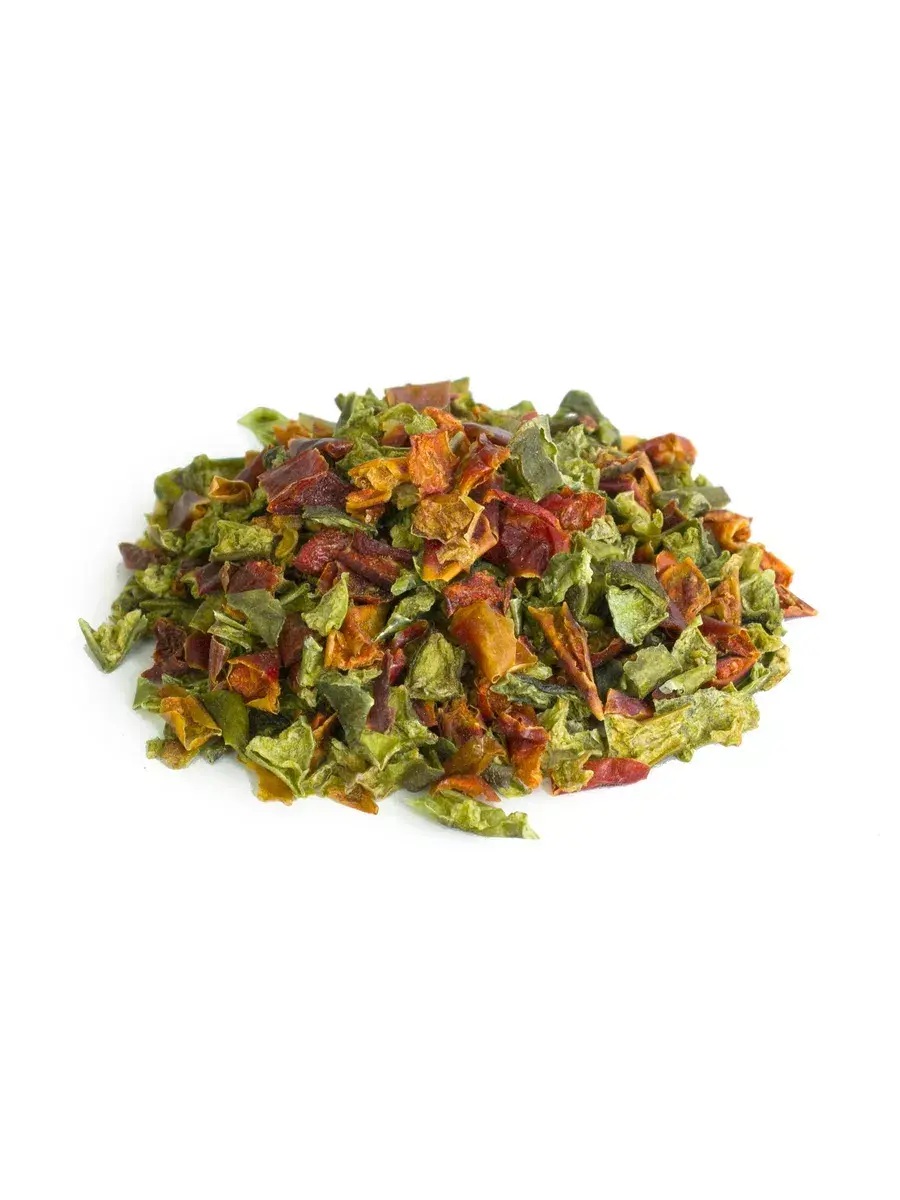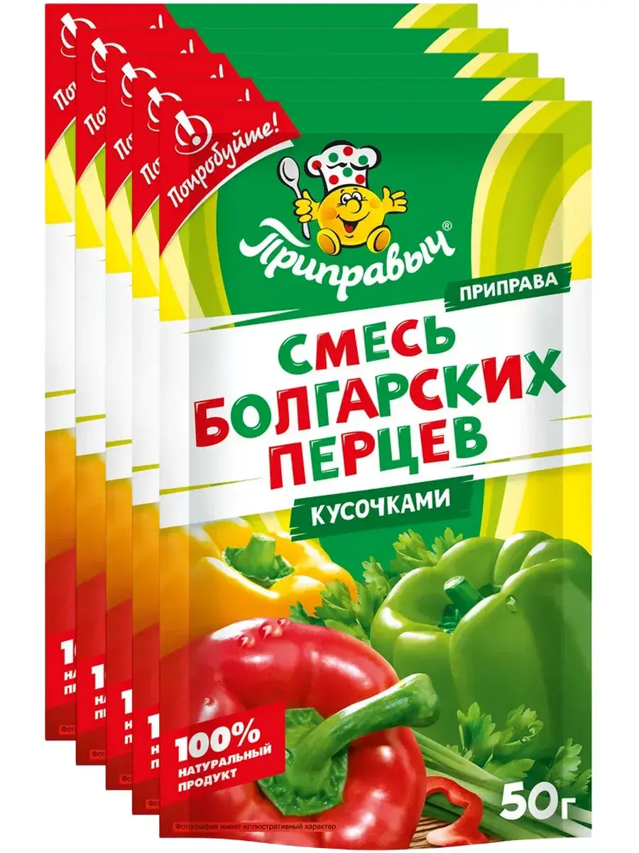 Болгарский перец - замечательный вкусный и полезный овощ, который можно употреблять как в свежем, так и в консервированном или сушеном виде. Мы предлагаем вам воспользоваться смесью из кусочков красного и зеленого сушенного сладкого болгарского перца. В любое время года эта смесь сделает ваше блюдо аппетитным, вкусным и нарядным, придав ему аромат болгарских перцев. В каких блюдах ее можно использовать? Смесь болгарских перцев используется во многих овощных и мясных блюдах. Прекрасное дополнение к омлетам, запеканкам, любым тушеным блюдам, супам. Незаменима при приготовлении традиционного венгерского гуляша. Внимание! Добавлять приправу «Смесь болгарских перцев» за 10-15 минут до готовности блюда! В комплекте 5 штук по 50г.