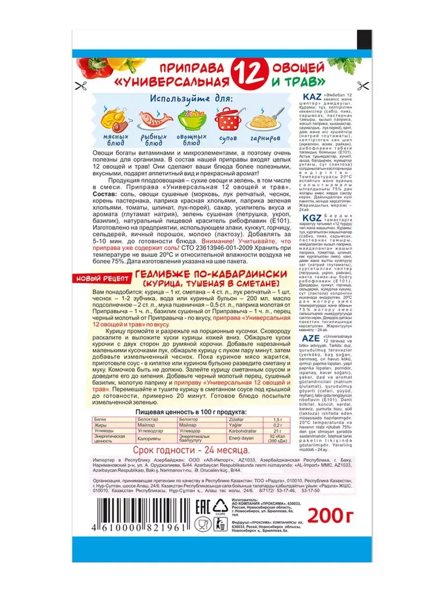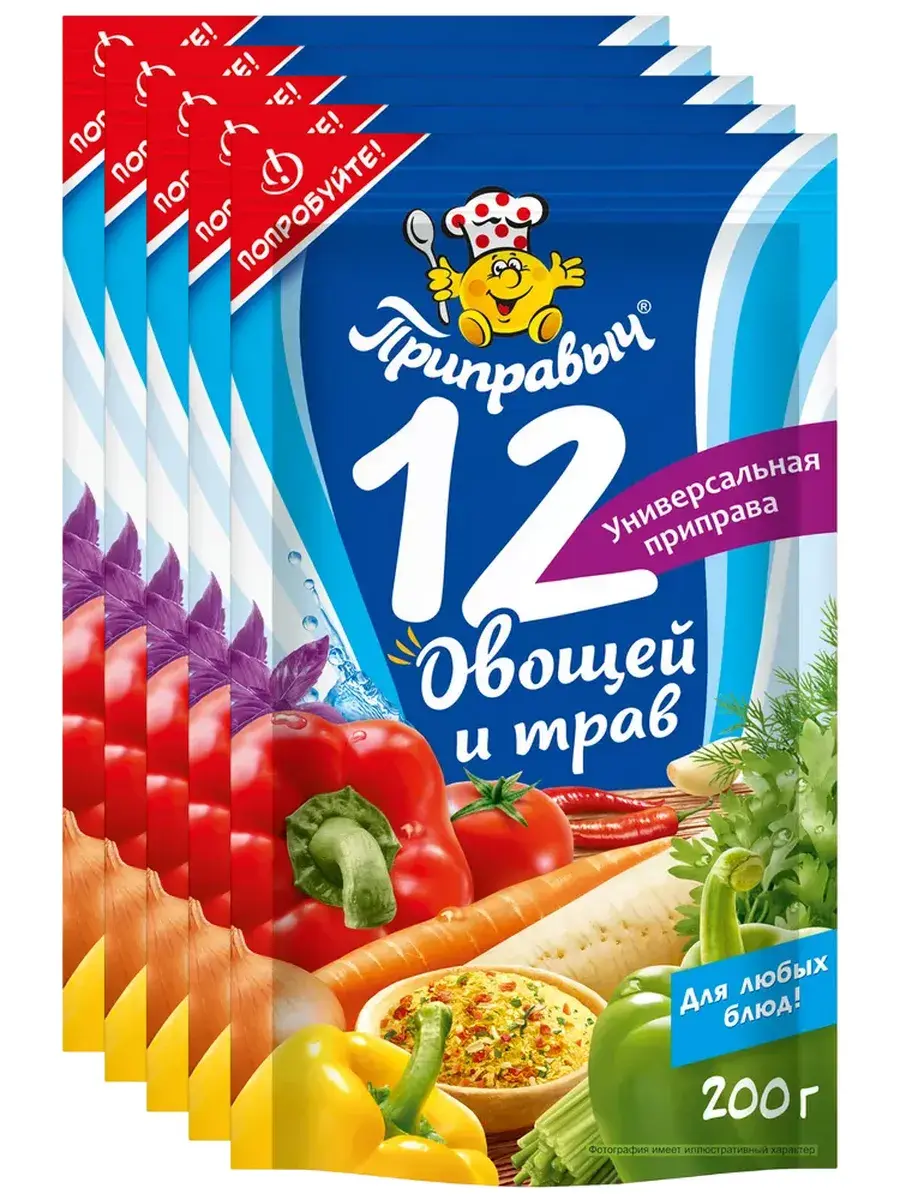 Овощи богаты витаминами и микроэлементами, а поэтому очень полезны для организма. В состав приправы входят целых 12 овощей и трав! Паприка – это лидер по количеству витамина С. Морковь улучшает работу печени, почек и замедляет процессы старения. Корни пастернака и петрушки содержат витамины и микроэлементы, благотворно влияющие на организм. Зелень петрушки регулирует солевой обмен, выводит продукты распада из организма. Укроп способствует понижению артериального давления. В базилике содержится кальций и витамин С, к тому же базилик стимулирует пищеварение. Лук обладает бактерицидными свойствами, стимулирует деятельность поджелудочной железы и сердца. Чеснок повышает устойчивость организма к инфекционным и простудным заболеваниям, нормализует обмен веществ. Великолепная смесь сушеных овощей и пряных трав прекрасно подходит для приготовления любых блюд из мяса, рыбы, овощей, а также различных супов, гарниров, соусов и т. д. 12 овощей и трав, входящих в состав приправы, сделают ваши блюда более полезными, вкусными, подарят аппетитный вид и прекрасный аромат! Добавлять приправу следует за 5-10 мин. до готовности блюда. В комплекте 5 штук по 200г.
