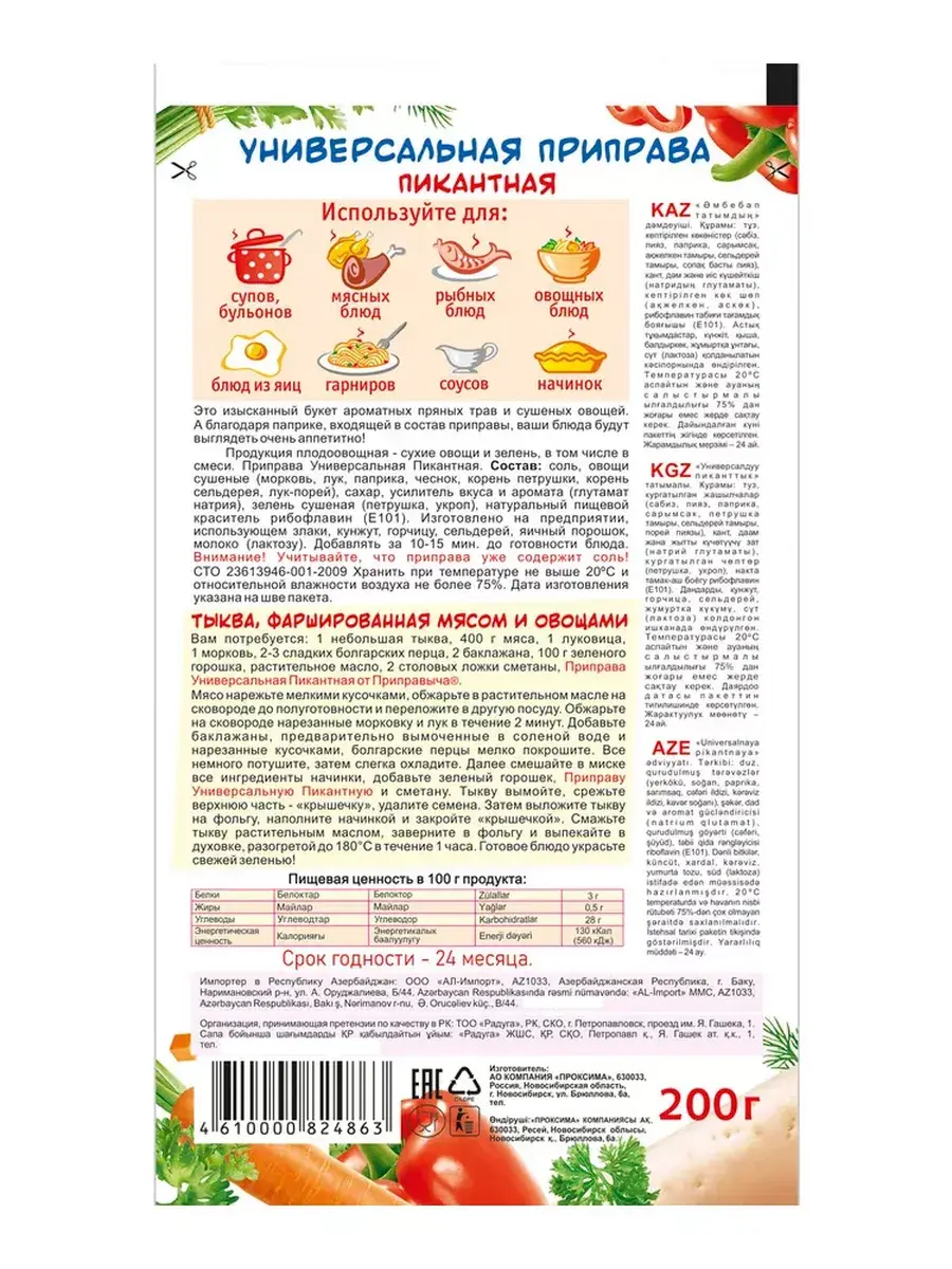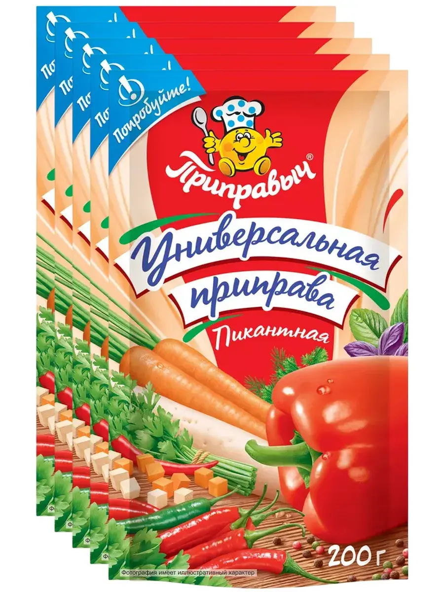 Приправа «Универсальная пикантная» – это изысканный букет ароматных пряных трав и сушеных овощей! Она придаст незабываемый вкус и подарит приятный аромат любым блюдам - супам, соусам, различным мясным, рыбным или овощным блюдам. А благодаря добавлению паприки, каждое из приготовленных вами блюд, приобретет оригинальный вкус и будет выглядеть очень аппетитно. Приправу следует добавлять за 15-20 мин. до готовности блюда. Всем нам известна польза овощей! Паприка – это лидер по количеству витамина С. Морковь улучшает работу печени, почек и замедляет процессы старения. Корень пастернака содержит витамины и микроэлементы, благотворно влияющие на организм. Зелень петрушки регулирует солевой обмен, выводит продукты распада из организма. Укроп способствует понижению артериального давления. Лук обладает бактерицидными свойствами, стимулирует деятельность поджелудочной железы и сердца. Учитывайте, что приправа уже содержит соль! В комплекте 5 штук по 200г.