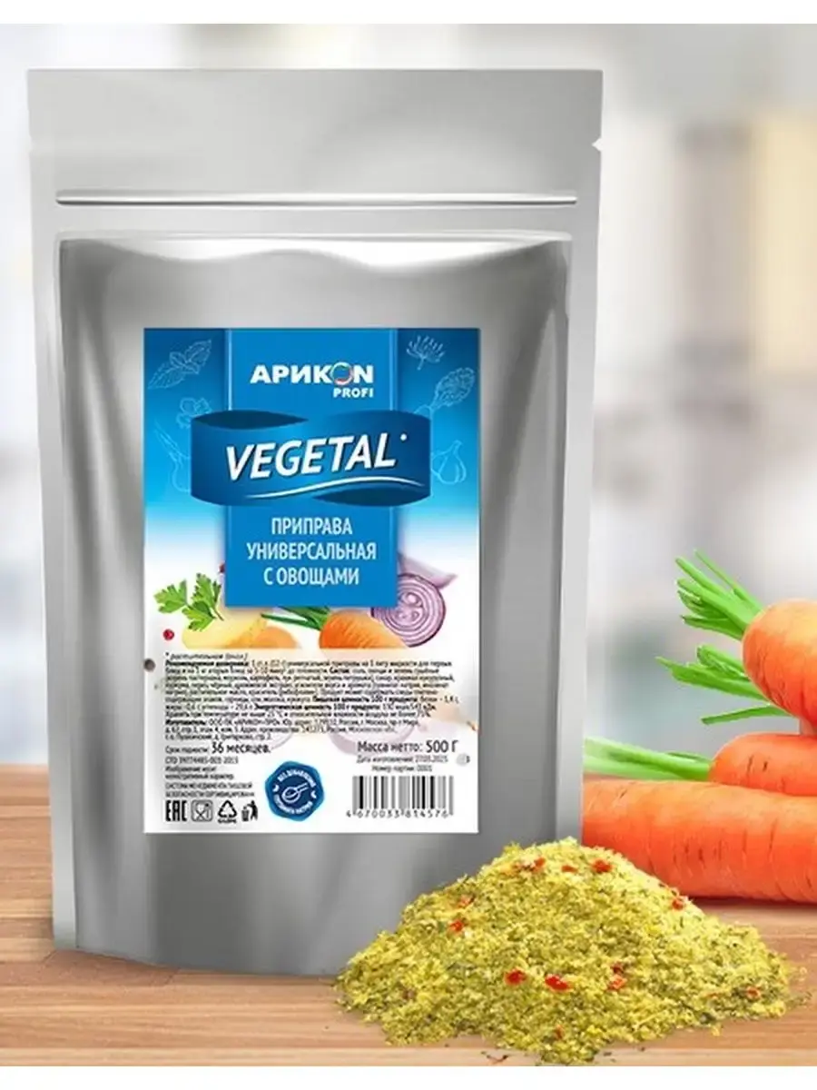 Приправа универсальная с овощами Вегетал представляет собой смесь сушеных овощей, трав и специй. на отлично подходит для приготовления супов, гарниров, мясных и овощных блюд. В ее состав входят натуральные сушеные овощи, комбинация которых сделает более богатым и выразительным вкус и аромат самых разных блюд. Приправа также отлично подойдёт для маринадов. Универсальная приправа — это полный набор в одном пакете, что позволит сэкономить на покупке различных составляющих и не займет много места на кухне.