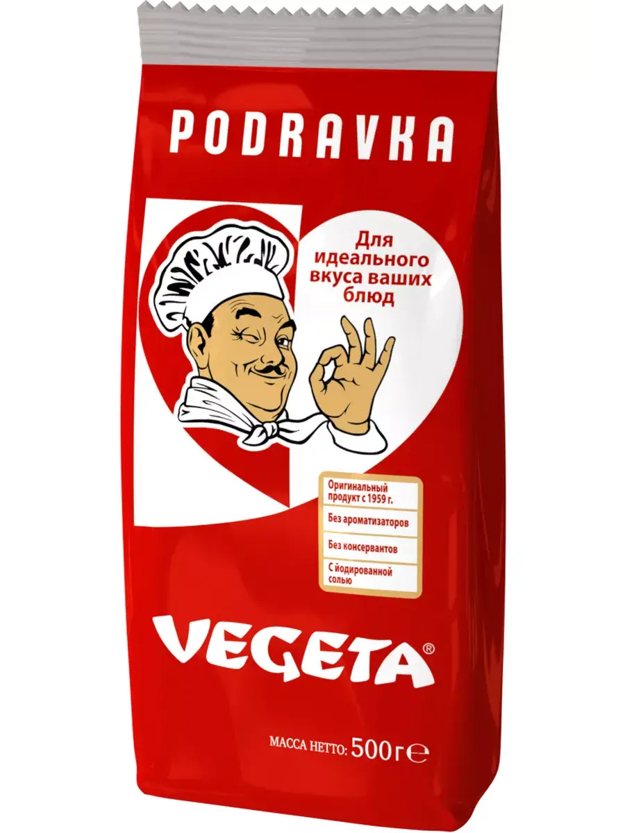 Приправа Vegeta – это приправа для первых блюд и гарниров, приготовленная путем соединения овощей и специй. Готовится из натуральных продуктов, выращенных без применения химических обработок. Такой подход позволил максимально сохранить в ней все полезные вещества, подаренные природой. Продукт настолько универсальный, что трудно назвать блюдо, для которого он не подходит. С каким бы продуктом вы не решили его соединить, результат будет однозначно высоким. Будь это суп, гарнир, закуска или мясо все без исключения заиграет новыми красками вкуса, наполнив ваш дом чудесным ароматом. Подходит для вареных, тушеных или жареных блюд (супов, соусов, риса, овощей, мяса, рыбы). Способ употребления: добавьте приправу Вегета из расчета 3 г приправы на 250 мл блюда за 5 минут до готовности. Или добавьте приправу по вкусу к мясу или рыбе до запекания. В комплекте 5 упаковок по 500г.