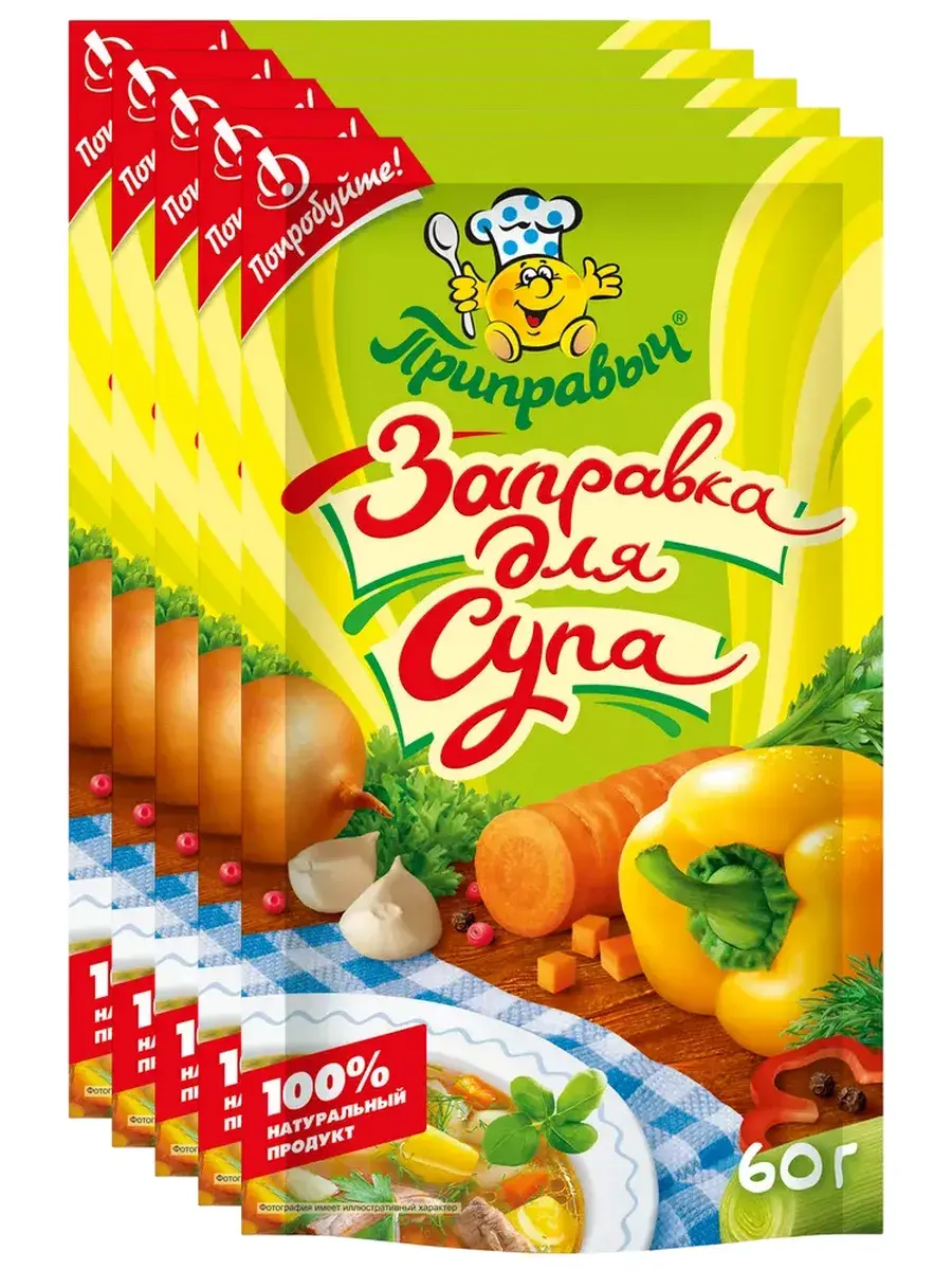 "Заправка для супа" - это смесь овощей и зелени, высушенных по специальной технологии, бережно сохраняющей для вас полезные свойства, вкус и цвет свежего продукта. Морковь улучшает работу печени. Паприка - лидер по количеству витамина С. Лук обладает бактерицидными свойствами, стимулирует деятельность печени, поджелудочной железы и сердца. Зелень петрушки улучшает работу почек и повышает аппетит. Укроп способствует понижению артериального давления. Чеснок повышает устойчивость организма к инфекционным и простудным заболеваниям. Заправка сделает ваше блюдо очень аппетитным и по-летнему нарядным с богатым и неповторимым вкусом и ароматом. В комплекте 5 штук по 60г.