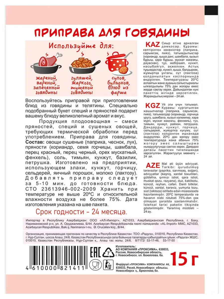 Воспользуйтесь приправой при приготовлении блюд из говядины и телятины. Специально подобранный букет специй и пряностей подарит вашему блюду великолепный аромат и вкус. Приправа подходит для приготовления говядины, гуляша, жаркого, супов.