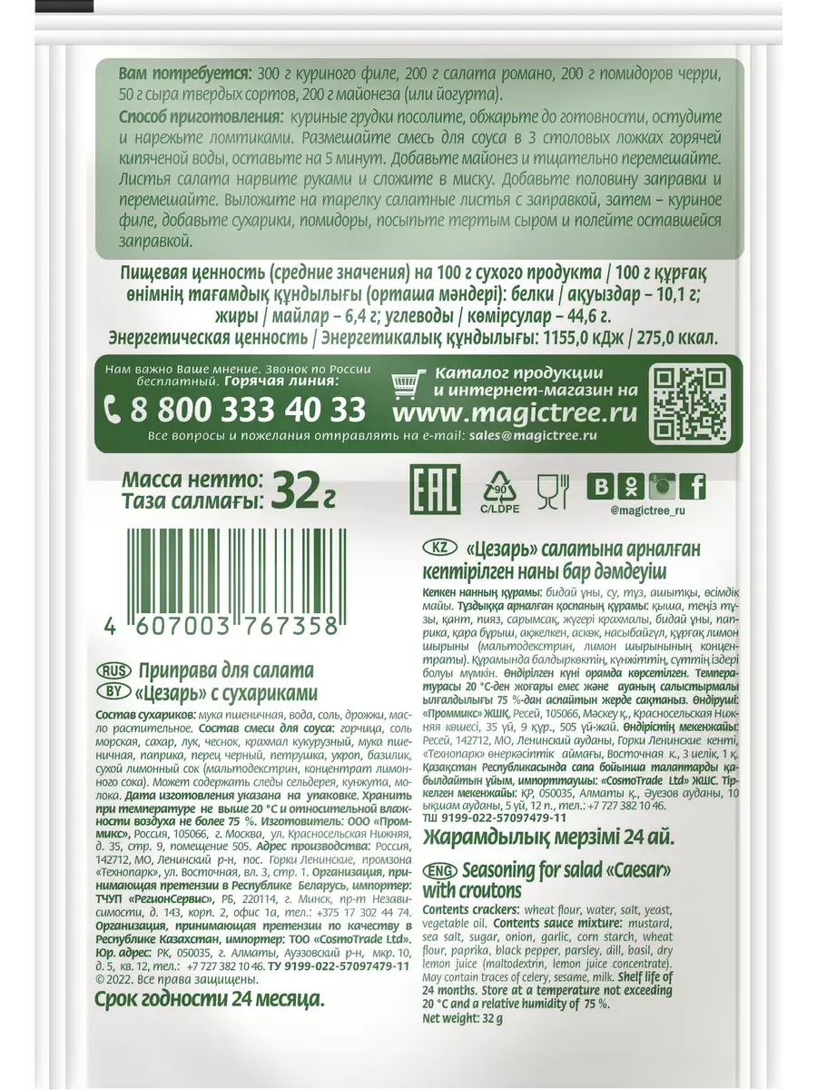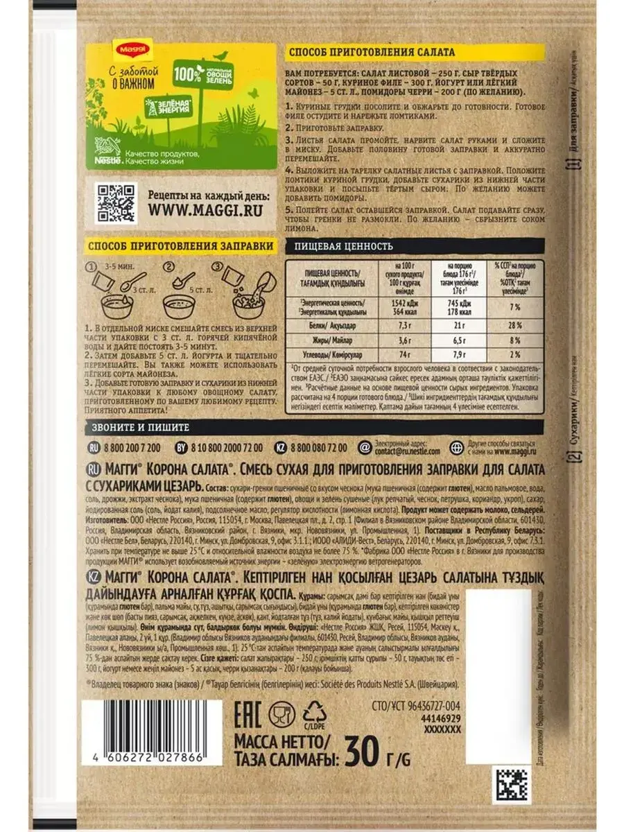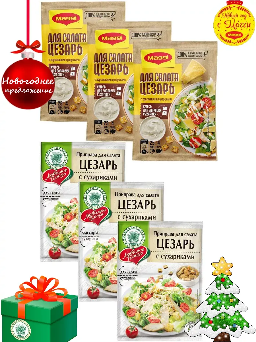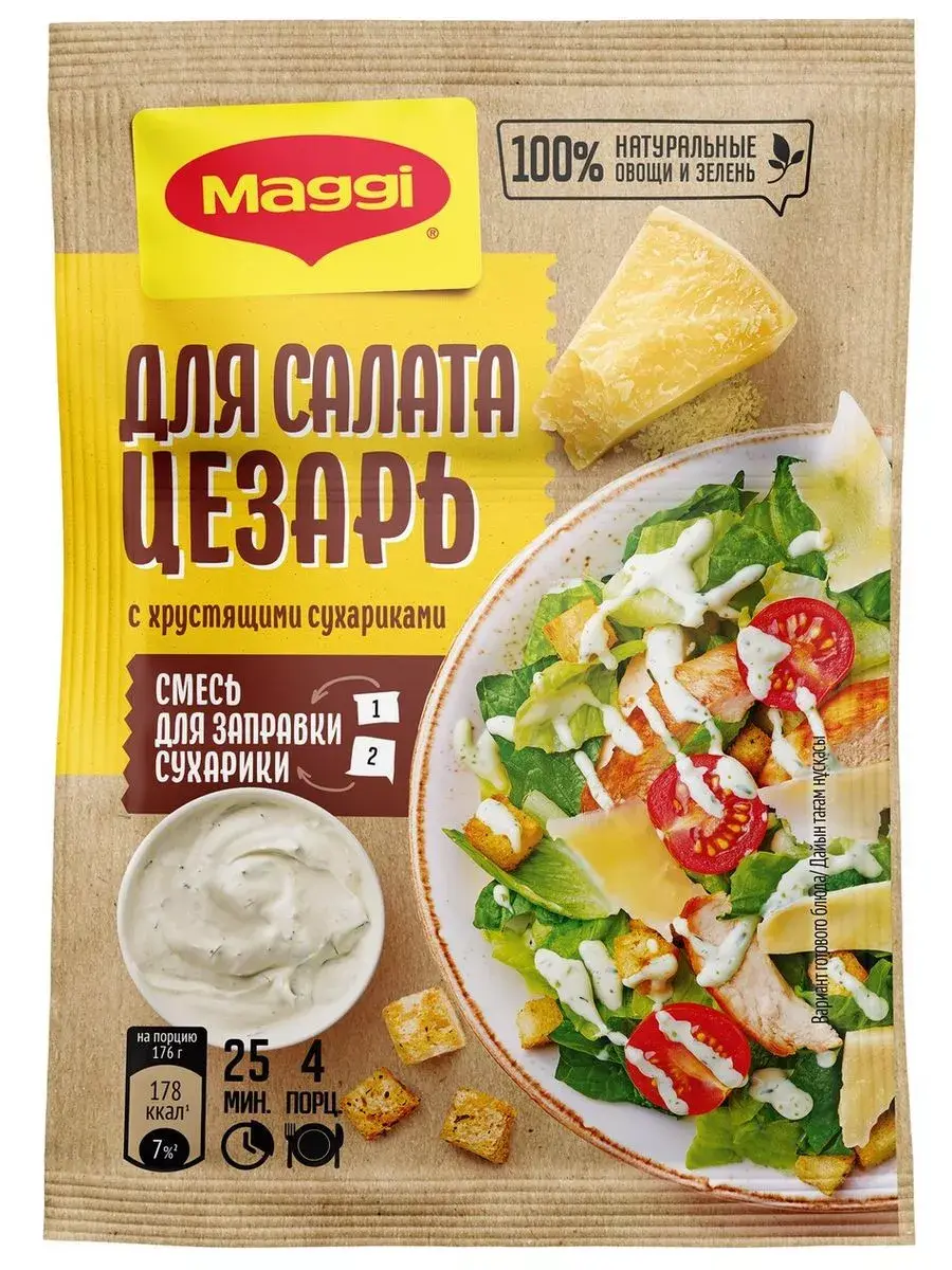 В двойных пакетах MAGGI и Волшебное Дерево для салата вы найдете готовую смесь для приготовления фирменного соуса, а также ароматные хрустящие сухарики. Приправы для соуса обладают насыщенным вкусом трав и специй, так легко узнаваемых в салате Цезарь.