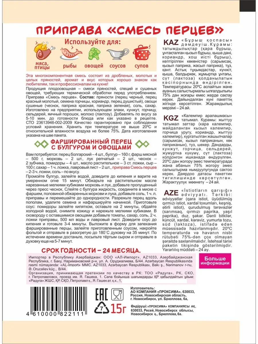 Эта пряная приправа смесь перцев обладает оригинальным ароматом и изысканным вкусом. Она добавляется при приготовлении различных блюд из мяса, рыбы, овощей, также хороша для супов, соусов и многих других блюд. Добавлять за 5-10 мин. до готовности блюда.