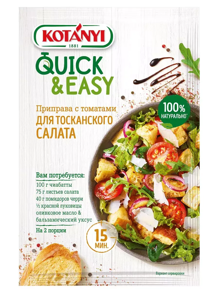 Приправа с томатами для тосканского салата Quick & Easy от Kotányi позволит приготовить вкусный средиземноморский салат с хлебом всего за 10 минут: рецепт и изысканная приправа для салата в одном. Такой салат вы еще не пробовали: теплая хрустящая чиабатта со сладкими помидорами черри и свежей рукколой. Блюдо дополнено пармезаном и заправкой с ароматными специями, включая перец чили, паприку и базилик.