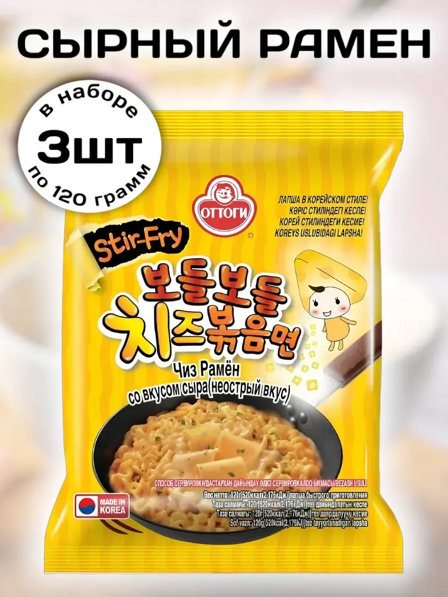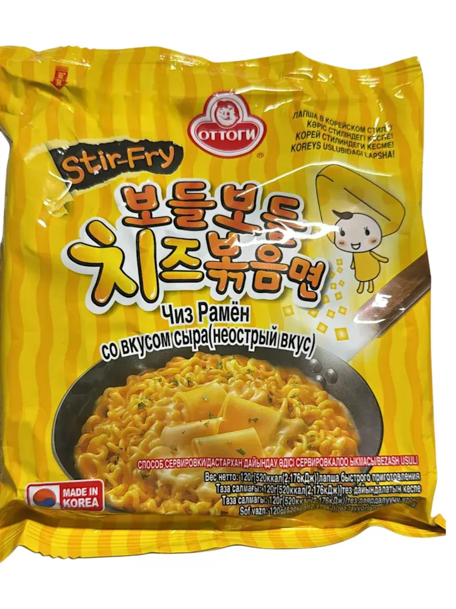 Приготовьтесь к кулинарному путешествию, которое вы еще не пробовали! Представляем вам восхитительный «Ottogi Stir-Fry Cheese Ramen» — идеальное сочетание насыщенного сыра и нежной лапши рамен, которое подарит вам незабываемые вкусовые ощущения. Жареная лапша с сыром отличается изысканным сырным вкусом, который обеспечивает более молочную, кремовую текстуру, приятную на вкус. Рамен достаточно сытный, он быстро утолит чувство голода, а также согреет и наполнит энергией. Упаковку сырного рамена удобно брать с собой в поездки, путешествия, походы, ведь на его приготовление требуется лишь несколько минут. Способ приготовления: добавьте в кастрюльку или сотейник 550 мл. воды (2 и 1/4 стакана), добавьте овощную смесь и доведите до кипения. После этого добавьте лапшу и суповую основу (приправу). Готовьте в течение 4 минут. По вашему вкусу дополнительно можно добавить яйцо, зелень, сыр и т.д. Снимите с огня, добавьте сырную пудру, хорошо перемешайте и наслаждайтесь вкусом настоящего корейского сырного рамена.