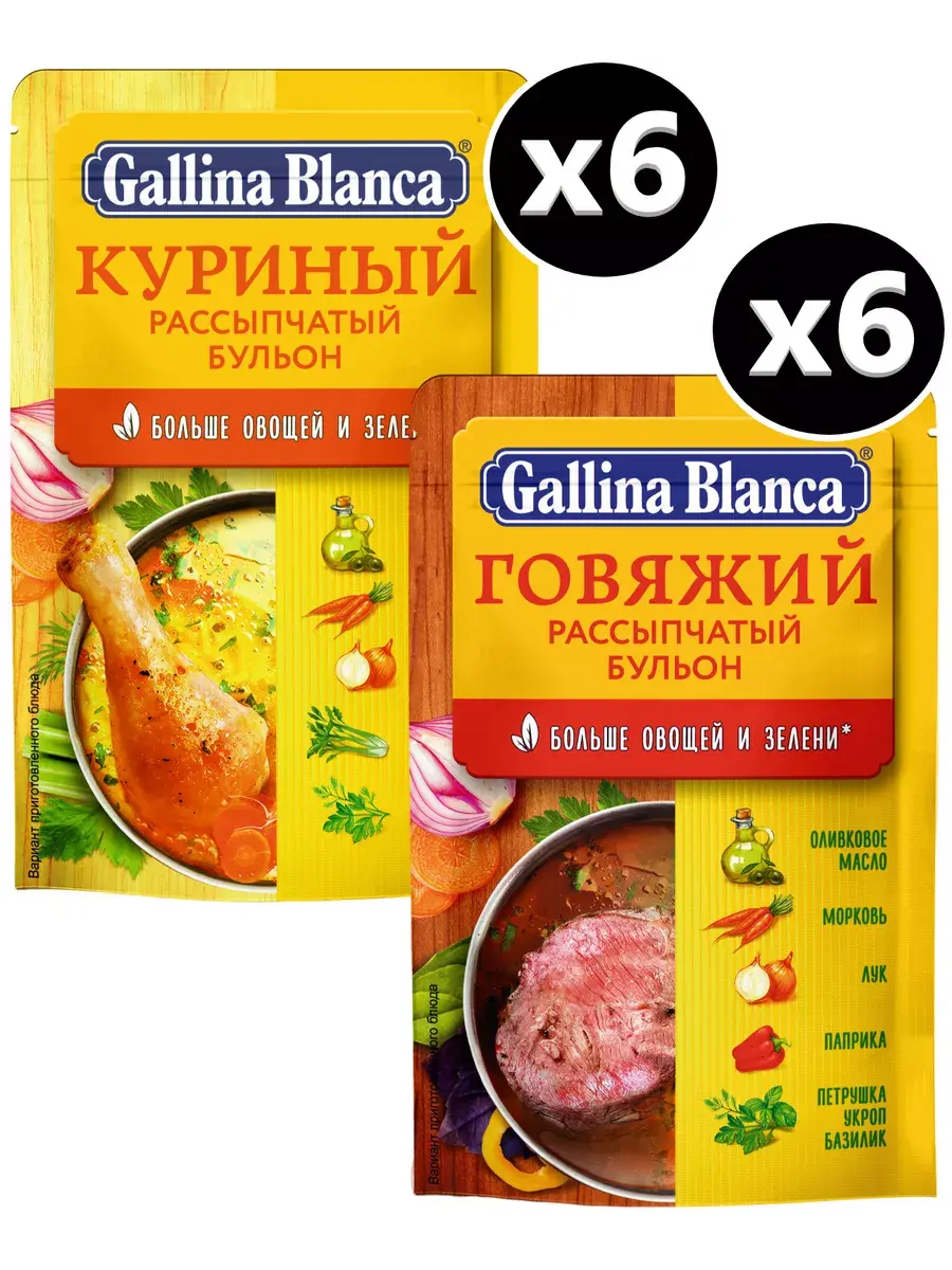 Gallina Blanca представляет новое поколение рассыпчатых бульонов с формулой, обогащенной оливковым маслом, с еще большим количеством овощей и зелени. Инновационная практичная упаковка с устойчивым дном и многоразовой застежкой делает хранение и использование продукта еще более удобным. Как приготовить Зразы с начинкой из куриного мяса: Шаг 1. Куриное филе мелко нарежьте, сыр натрите на тёрке. В сковороде разогрейте сливочное масло и обжарьте курицу в течение трёх минут, после чего добавьте сыр. Перемешайте, снимите с огня и дайте остыть. Шаг 2. Фарш приправьте, добавьте в него «Куриный рассыпчатый бульон» Gallina Blanca и слепите из фарша лепёшки. Хлеб аккуратно раскрошите руками. Полученной крошкой посыпьте рабочую поверхность, затем выложите на неё слепленные из фарша лепёшки. Положите в середину каждой по 1 ст. л. начинки из куриного мяса, соедините края лепёшки, чтобы сформовать котлеты. Шаг 3. Обжарьте котлеты в разогретом масле по 4 минуты с каждой стороны. Затем, уменьшив огонь, готовьте под крышкой в течение 10 минут. В комплекте 6 пакетиков по 90г каждого вида.