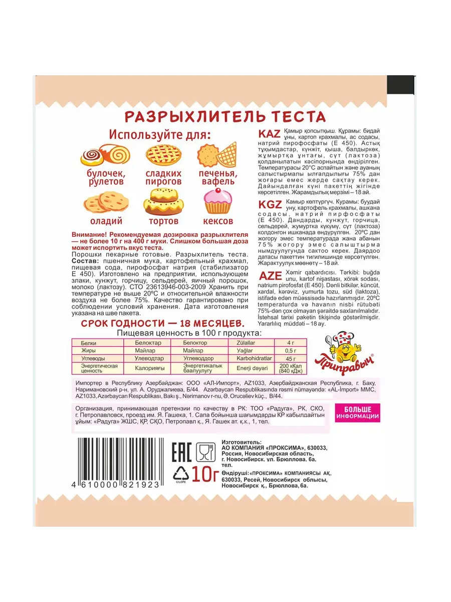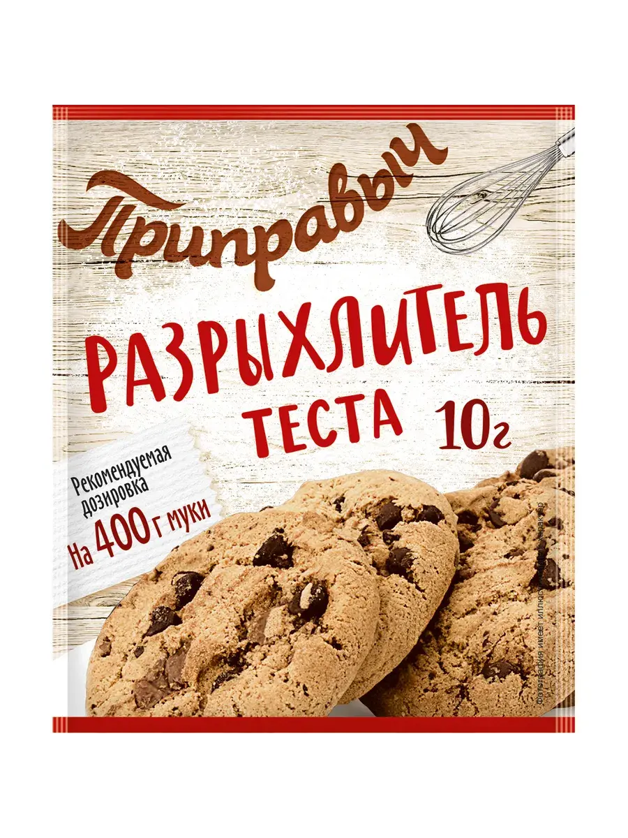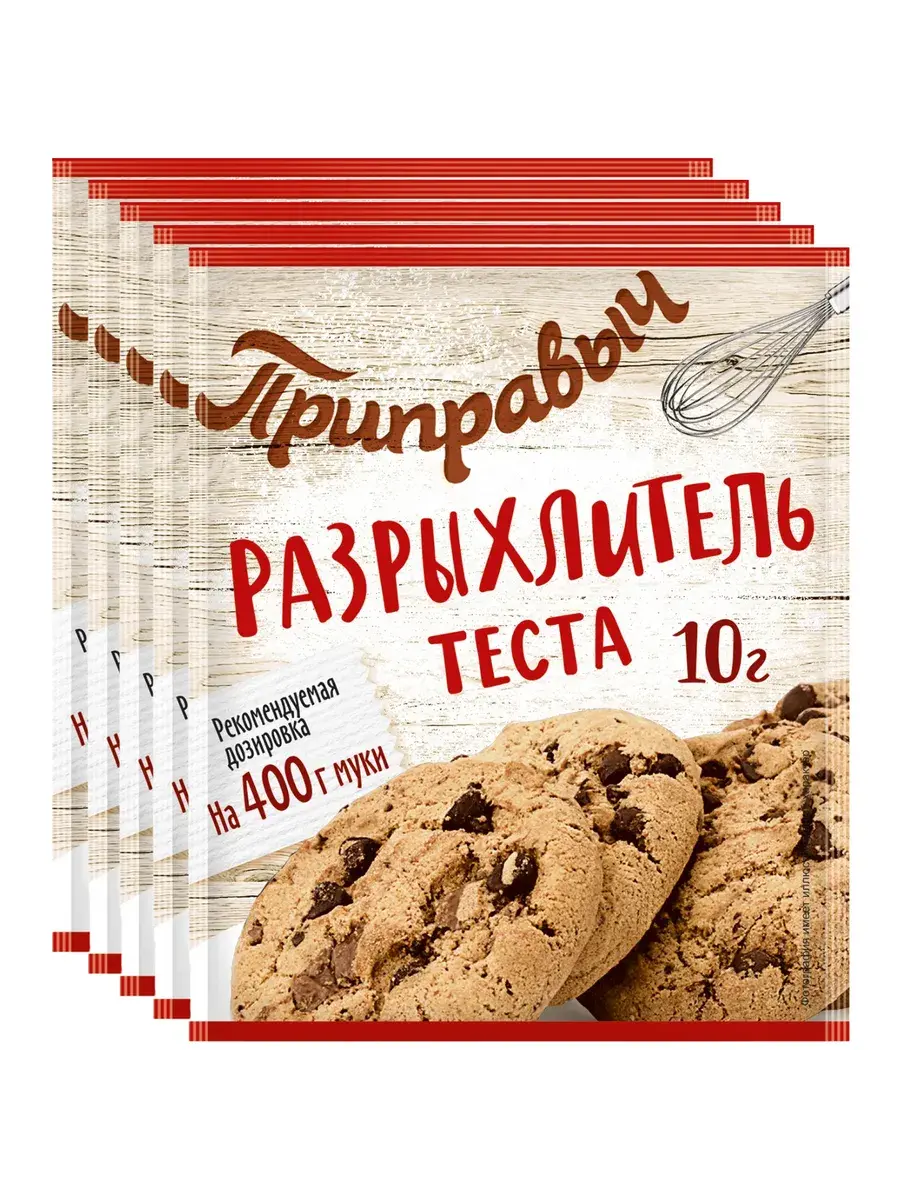 Разрыхлитель теста "Приправыч" – воздушная выпечка без хлопот! Хочешь, чтобы твои кексы, печенье и блинчики были пышными, мягкими и румяными? Просто добавь разрыхлитель теста – он заменяет соду и делает тесто идеальным! Изделия из разрыхлённого теста хорошо пропекаются, обладают приятным внешним видом, ароматом и вкусом. Рекомендованная дозировка: 10 г разрыхлителя на 400 г муки. Подходит для: тортов, пирожных, печенья, кексов, пряников, блинов и другой выпечки. С "Приправыч" твои сладкие шедевры поднимутся на новый уровень! В комплекте 5 пакетиков по 10г.