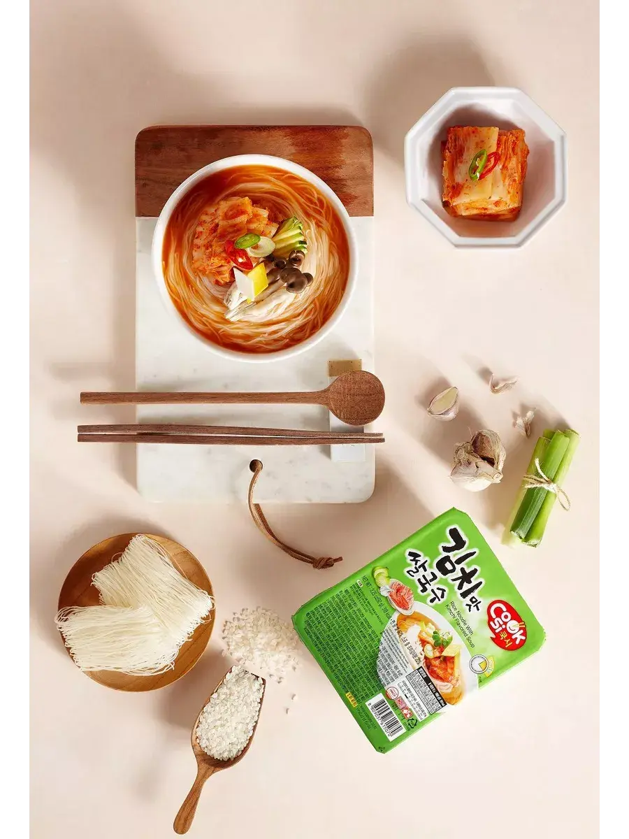 "Rice Noodle With Kimchi Flavor" - лапша быстрого приготовления из рисовой муки, длинная и тонкая лапша с насыщенным бульоном со вкусом кимчи. Изготовленная из высококачественного риса, лапша обладает нежным вкусом кимчи и приятной текстурой. Популярный вкус в корейской кухне. Способ приготовления: Открыть крышку и высыпать приправу на вермишель. Залить кипятком до линии, указанной внутри упаковки. Закрыть крышкой на 3-4 минуты. Хорошо перемешать. В комплекте 4 упаковки по 92г.