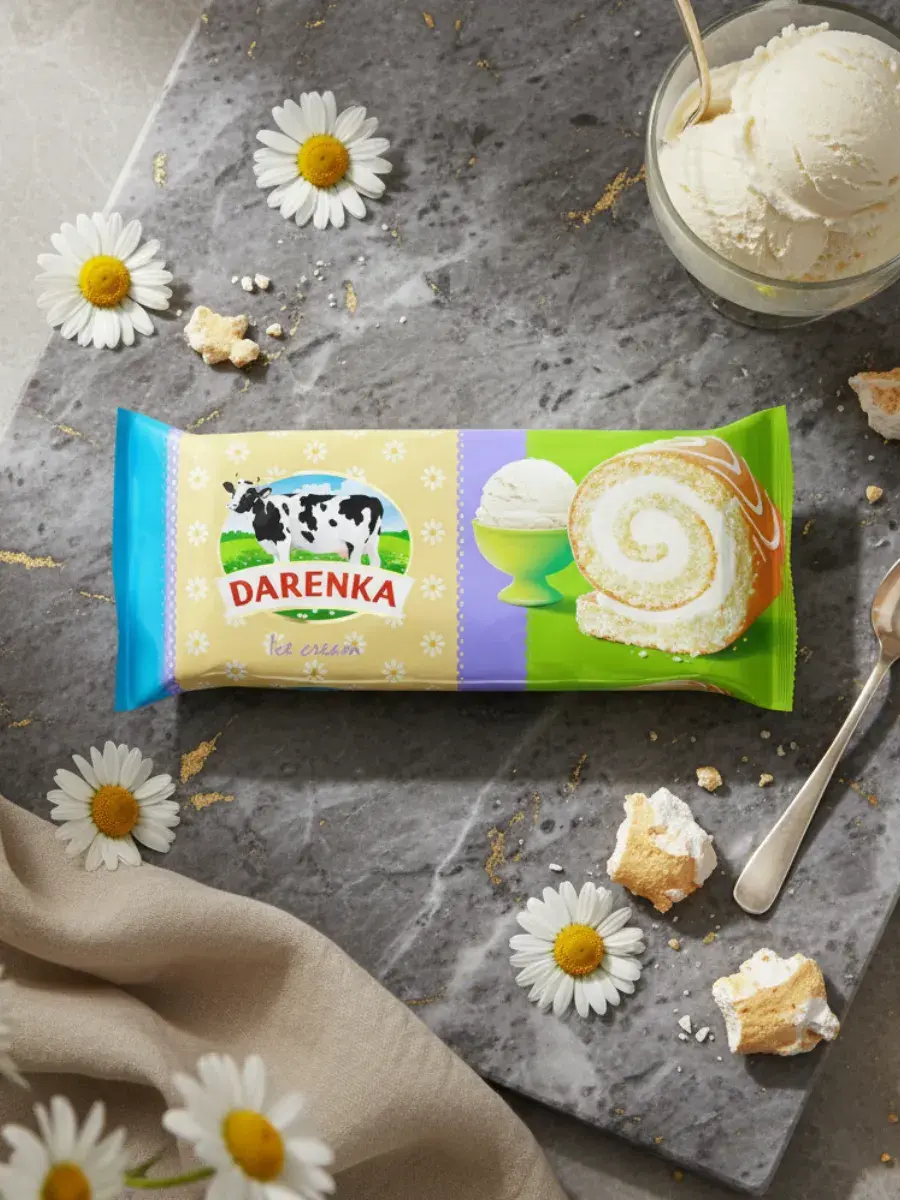Рулет Darenka со вкусом пломбира — это настоящее воплощение уюта и тепла, свернутое в нежный бисквит. Мягкий, ароматный, он буквально тает во рту, оставляя лёгкое сливочное послевкусие, как любимое мороженое из детства. Каждая ложечка крема внутри — напоминание о спокойных вечерах, когда жизнь не спешит, а чай пахнет домом. Darenka — это десерт, который не просто утоляет сладкую тягу, а дарит ощущение заботы и комфорта. Стоит только открыть упаковку, и вокруг словно становится светлее, теплее и вкуснее. Этот рулет создан для тех моментов, когда хочется немного тепла и заботы — к чашке чая, фильму или просто чтобы порадовать себя.