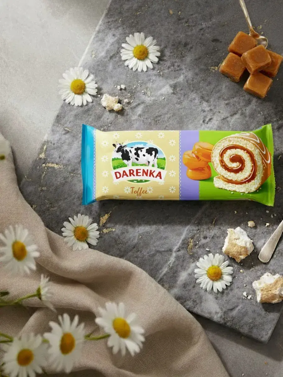 Рулет Darenka со вкусом тоффи — это уютный десерт с характером. Нежный бисквит скрывает внутри мягкий крем с карамельными нотами, которые тают во рту и оставляют приятное послевкусие ириски. Он словно создан для тех вечеров, когда хочется чего-то по-домашнему сладкого и чуть роскошного одновременно. Один кусочек — и мир становится теплее, а день вкуснее. Darenka с тоффи — это идеальный дуэт нежности и карамели, к которому хочется возвращаться снова и снова.