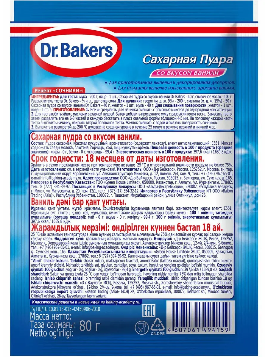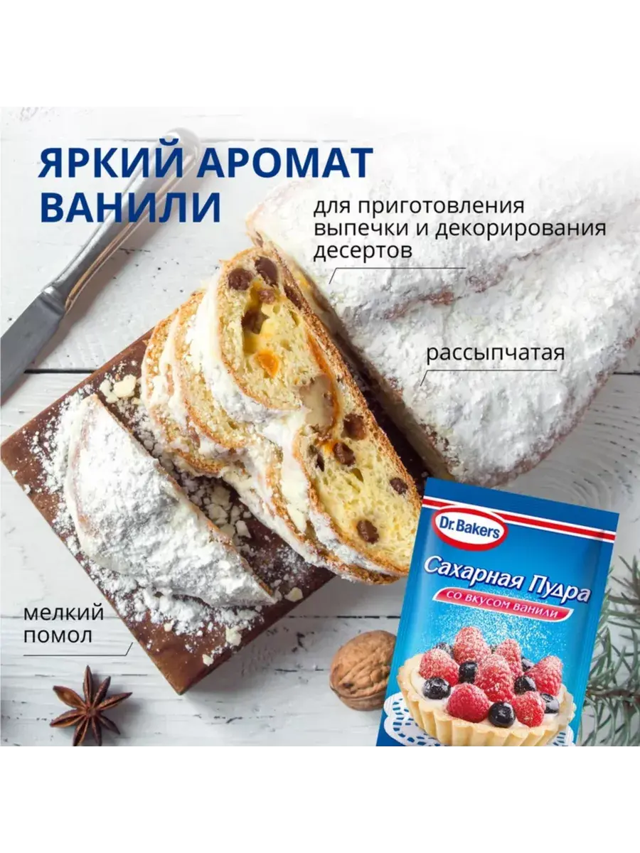 Сахарная пудра со вкусом ванили подходит для украшения и придания аромата ванили выпечке. Сахарную пудру можно использовать для посыпки пирогов и кексов, добавлять в крем или взбитые сливки. Из сахарной пудры также можно приготовить глазурь Сахарная пудра со вкусом ванили Dr.Bakers — незаменимый компонент выпечки.