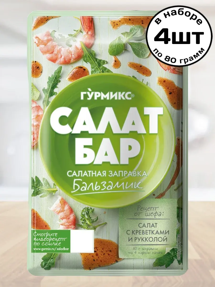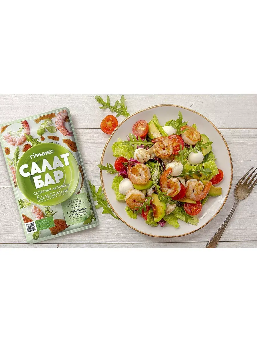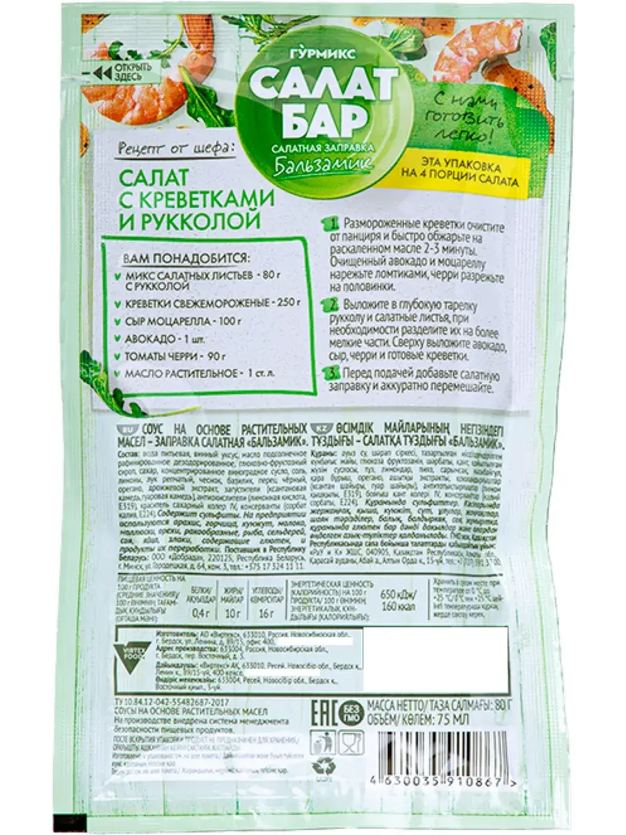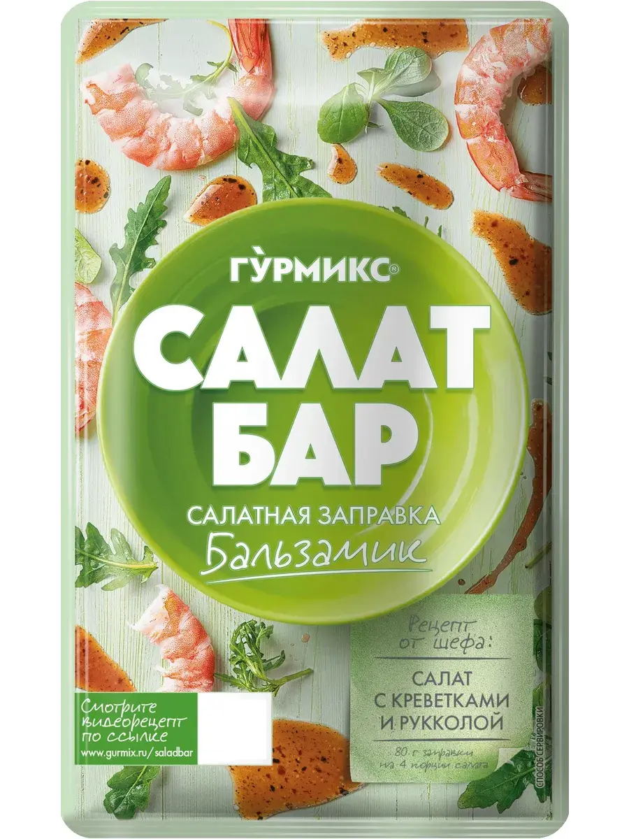 Салатная заправка Бальзамик - соус, предназначенный для придания салатам дополнительных вкусовых качеств (пикантности, сочности, сладости, кислоты) и соединения ингредиентов салата между собой. Пакетик жидкой заправки рассчитан на 4 порции салата. На обратной стороне упаковки предложен рецепт салата с креветками и рукколой. Способ приготовления: Размороженные креветки очистите от панциря и быстро обжарьте на раскаленном масле 2–3 минуты. Очищенное авокадо и моцареллу нарежьте ломтиками, черри разрежьте на половинки. Выложите в глубокую тарелку рукколу и салатные листья, при необходимости разделите их на более мелкие части. Сверху выложите авокадо, сыр, черри и готовые креветки. Перед подачей добавьте салатную заправку и аккуратно перемешайте.