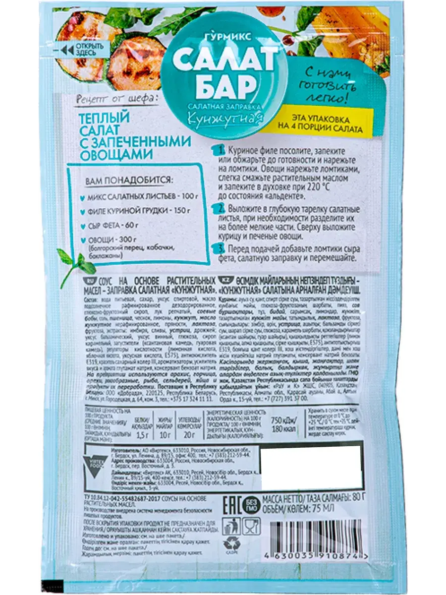 Салатная заправка Кунжутная– это заправка для салата на основе растительных масел с добавлением пряностей и бальзамического уксуса. Пакетик жидкой заправки рассчитан на 4 порции салата. Кунжут придает ореховую нотку в блюда, перец – остроту, а цитрусовые – кислинку и свежесть. На обратной стороне упаковки предложен рецепт теплого салата с запеченными овощами. Способ приготовления: Куриное филе слегка посолите, запеките или обжарьте до готовности и нарежьте на ломтики. Овощи нарежьте ломтиками, слегка смажьте растительным маслом и запеките в духовке при 220 °С до состояния «альденте». Выложите в глубокую тарелку салатные листья, при необходимости разделите их на более мелкие части. Сверху выложите курицу и печёные овощи. Перед подачей добавьте ломтики сыра фета, салатную заправку и перемешайте.