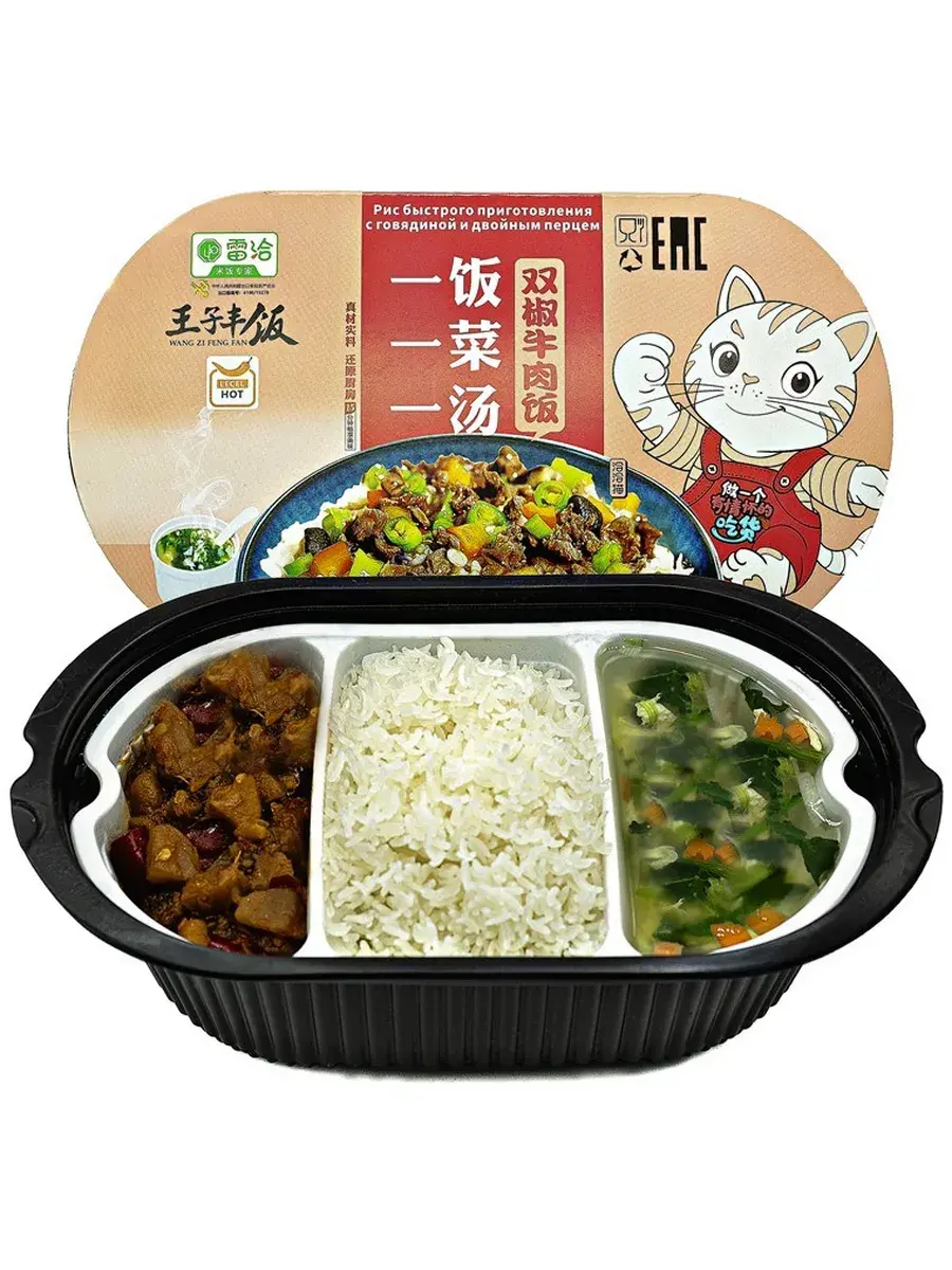 Представляем вам саморазогревающийся рис быстрого приготовления с говядиной и двойным перцем – отличный выбор для тех, кто любит вкусную и ароматную китайскую и корейскую еду. Идеально подходит для тех, кто находится в постоянном движении, будь то походы, путешествия или рабочий день. Благодаря саморазогревающемуся пакету, вам не нужно искать источник тепла для приготовления еды. Рис готовится очень быстро и не требует никаких дополнительных усилий. Способ приготовления: Вскрыть пакеты с рисом, овощами, мясом и водой и поместить содержимое во внутреннюю чашку; Снять прозрачную плёнку с нагревательного пакета, поместить его в нижнюю чашку и добавить холодной воды до отметки; Сразу вставить белую чашку во внутрь и закрыть крышкой; Через 15 минут открыть крышку, перемешать. Приятного аппетита!