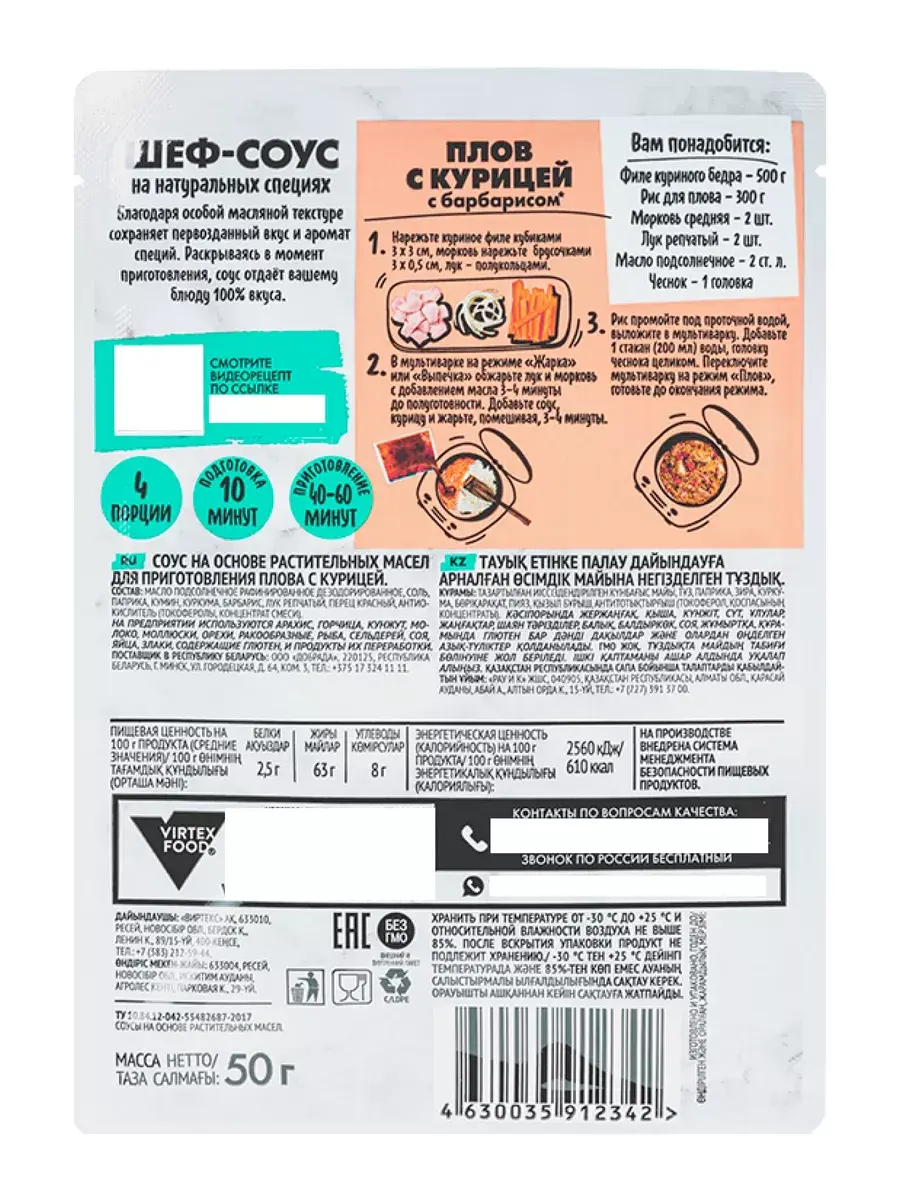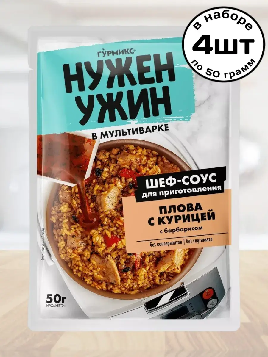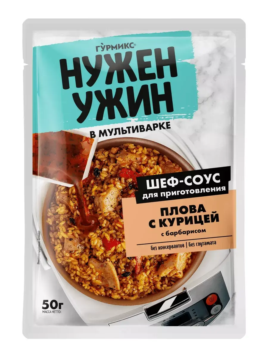Гурмикс представляет линейку готовых ШЕФ-СОУСОВ НУЖЕН УЖИН. Теперь разнообразно и быстро готовить дома еще проще. "Нужен Ужин" дает идеи и решения для семейного ужина. Шеф-соус с пряной зирой для приготовления рассыпчатого плова с курицей и барбарисом в мультиварке — идеальное соотношение специй, не нужно добавлять дополнительные пряности. Особая масляная текстура сохраняет вкус и аромат специй и раскрывает их в момент приготовления. Одна упаковка рассчитана на 4 порции. Способ приготовления: Нарежьте куриное филе кубиками 3 × 3 см, морковь нарежьте брусочками 3 × 0,5 см, лук — полукольцами. В мультиварке на режиме «Жарка» или «Выпечка» обжарьте лук и морковь с добавлением масла 3–4 минуты до полуготовности. Добавьте соус, курицу и жарьте, помешивая, 3–4 минуты. Рис промойте под проточной водой, выложите в мультиварку. Добавьте 1 стакан (200 мл) воды, головку чеснока целиком. Переключите мультиварку на режим «Плов», готовьте до окончания режима.