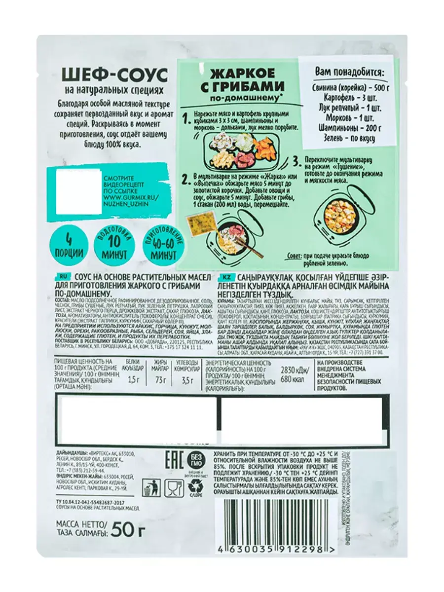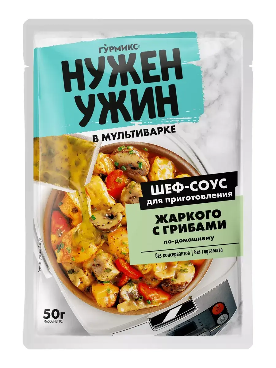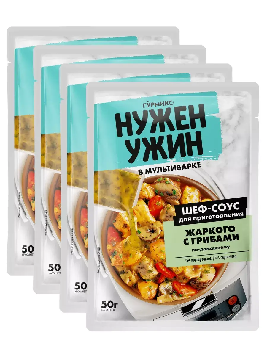 Гурмикс представляет линейку готовых Шеф-Соусов Нужен Ужин. Теперь разнообразно и быстро готовить дома еще проще. Нужен Ужин дает идеи и решения для семейного ужина. Этот соус создан с заботой о вас и вашей семье, чтобы сделать процесс приготовления быстрым, легким и невероятно вкусным. Соус сочетает в себе насыщенные грибы, ароматные специи и секретный букет трав, что придаст вашему жаркому особую изысканность. Подходит для приготовления различных видов жаркого – от классического говяжьего до вегетарианских версий с овощами и грибами. В комплекте 4 пакетика по 50г. Одна упаковка рассчитана на 4 порции.