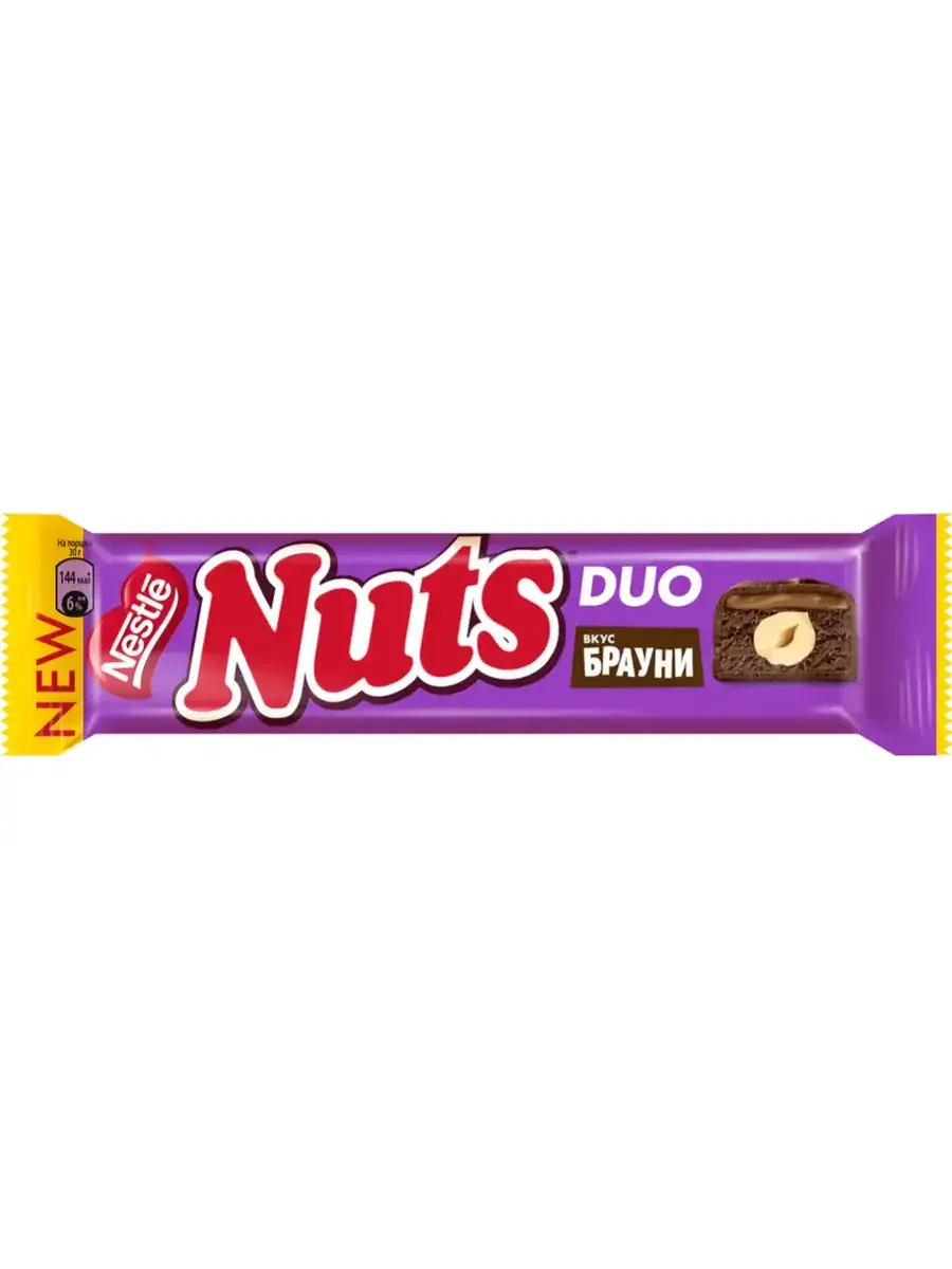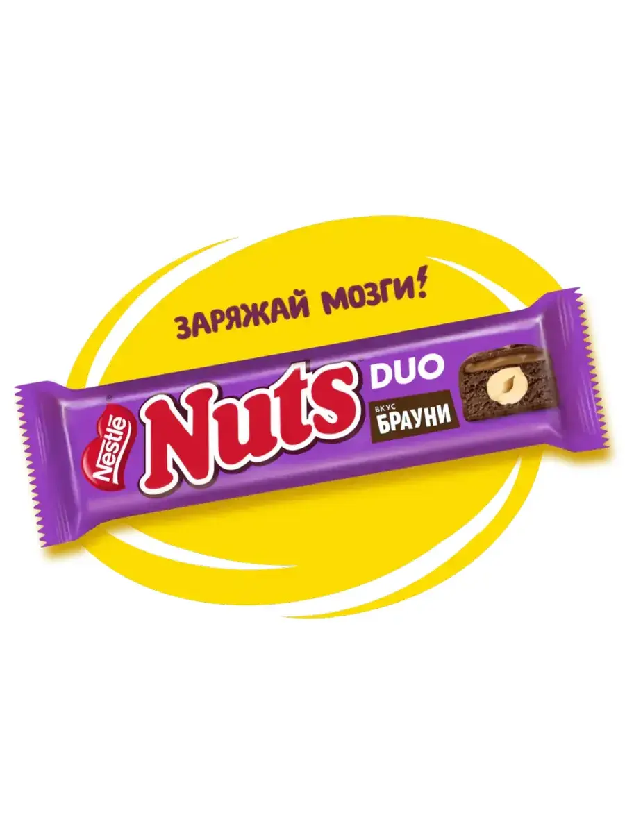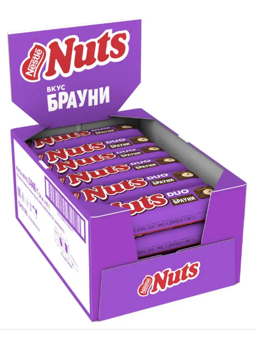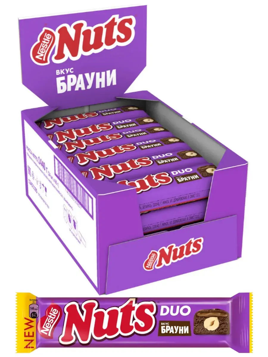 Главная “фича” шоколадных батончиков Nuts – цельные лесные орехи. В новом батончике Nuts остается верен себе и предлагает бомбическое сочетание цельного фундука, нежной нуги, мягкой карамели и тертого какао, придающего батончику интенсивный шоколадный вкус популярного десерта брауни. Вся эта вкуснятина покрыта превосходной шоколадной глазурью. Натс – заряжай мозги! Единственный шоколадный батончик, который содержит настоящие цельные лесные орехи. Богатые питательными веществами орешки, как доказано учеными, стимулируют мозговую активность, заряжают мозг энергией для умственной нагрузки. В блоке 24 батончика по 60г.
