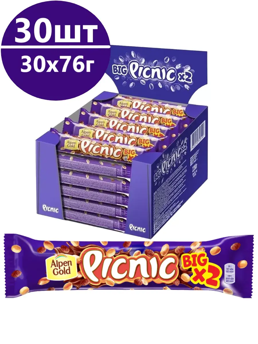 Шоколадный батончик Picnic Big - это настоящий взрыв вкуса! Яркий и насыщенный вкус арахиса и изюма дополнен хрустящей вафлей и воздушным рисом, которые создают неповторимую текстуру. Нежный молочный шоколад придает еще больше вкуса, создавая идеальное сочетание с начинкой. Возьмите его с собой в дорогу, на учебу или работу. Он зарядит вас энергией и придаст сил для больших достижений! Нежный молочный шоколад в сочетании с хрустящими вафлями подарит вам необыкновенное наслаждение. А арахис и изюм делают вкус батончика более ярким и богатым. В комплекте 30шт батончиков по 76г.