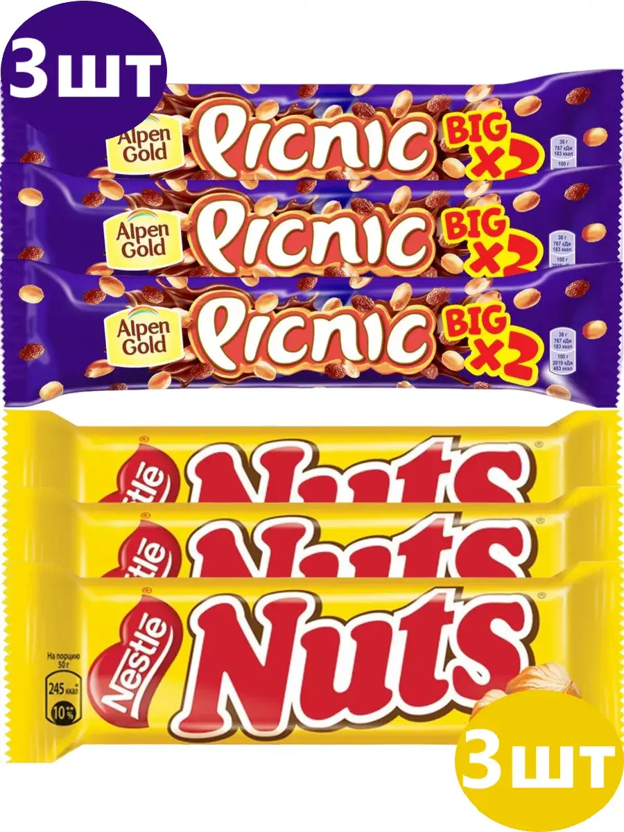 Шоколадный батончик Picnic Big - это настоящий взрыв вкуса! Яркий и насыщенный вкус арахиса и изюма дополнен хрустящей вафлей и воздушным рисом, которые создают неповторимую текстуру. Нежный молочный шоколад придает еще больше вкуса, создавая идеальное сочетание с начинкой. Сладкий Nuts от Nestle – единственный шоколадный батончик, который содержит настоящие цельные лесные орехи. Богатые питательными веществами орешки, как доказано учеными, стимулируют мозговую активность, заряжают мозг энергией для умственной нагрузки.