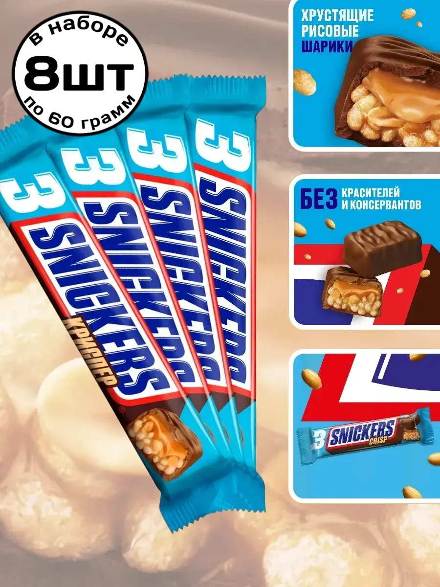 Сникерс Криспер — это вкусное и хрустящее обновление классического батончика Snickers. Внутри вас ждет аппетитное сочетание воздушного риса, нежной карамели и цельного жареного арахиса, покрытого слоем молочного шоколада. Легкая текстура и насыщенный вкус делают этот батончик идеальным перекусом в течение дня. Он не такой плотный, как классический сникерс, поэтому отлично подойдет тем, кто хочет побаловать себя сладким, но без ощущения тяжести. Тройная порция удовольствия для тех, кто любит хрустящие и насыщенные сладости! Формат Трио включает три небольших батончика в одной упаковке — удобно взять с собой, поделиться с друзьями или растянуть удовольствие на целый день. В наборе 8 батончиков по 60г.