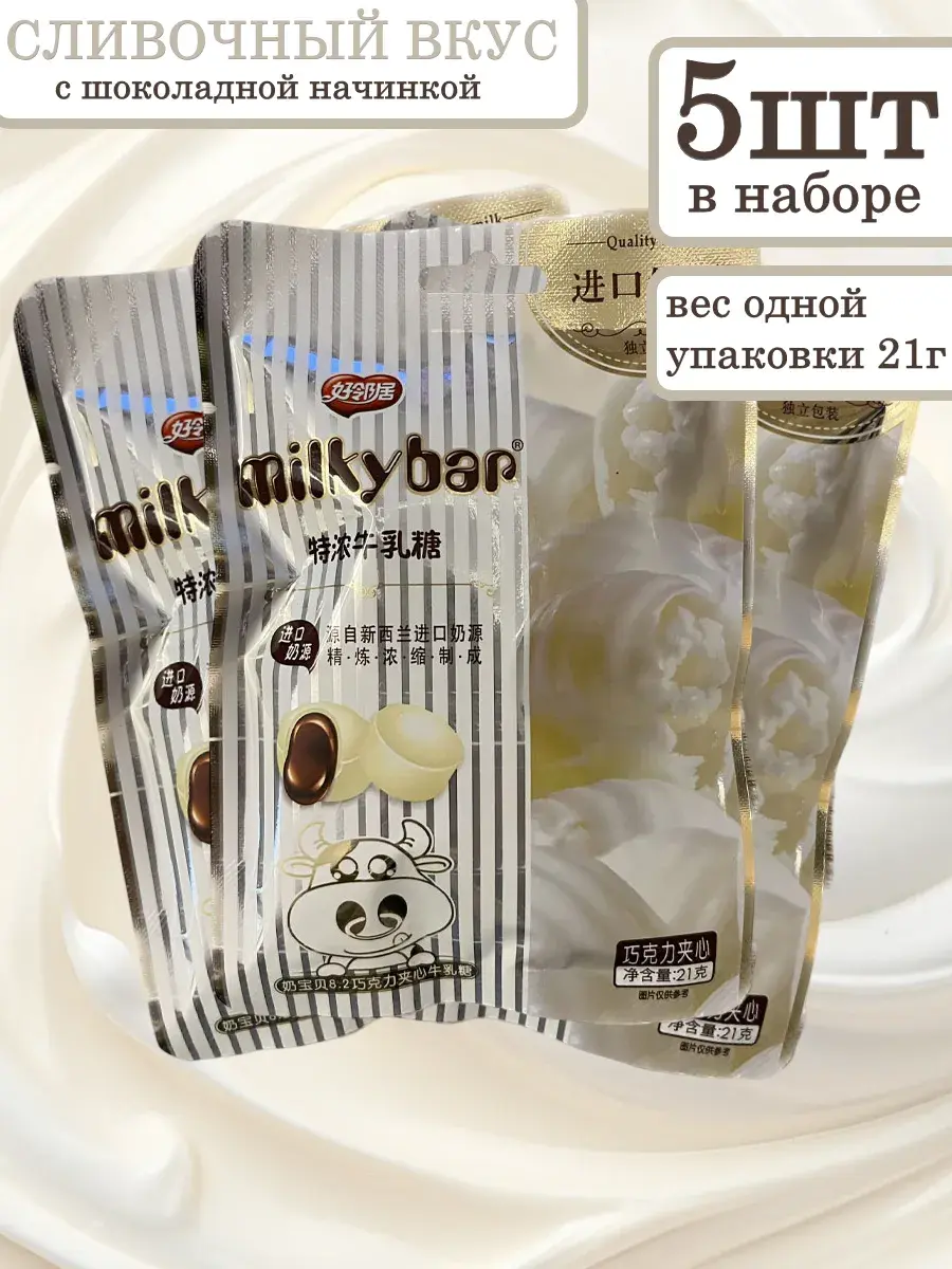 Почувствуйте вкус детства с молочными конфетами Milkybar! Каждая конфетка насыщена ароматом сгущенного молока и создана из натуральных ингредиентов, включая молоко высшего качества. А внутри вас ждет нежная шоколадная начинка, которая добавляет еще больше удовольствия к каждому укусу. Эти сладости не просто тают во рту – они наполняют день теплом и уютом. Отличный выбор для чашки чая, угощения друзей или просто для того, чтобы побаловать себя. Хотите добавить сладости в свой день? Эти конфеты идеально подходят для любого случая! Комплимент к утреннему кофе, лакомство в дорогу, милый подарок для тех, кого вы цените. В комплекте 5 пачек по 21 г.