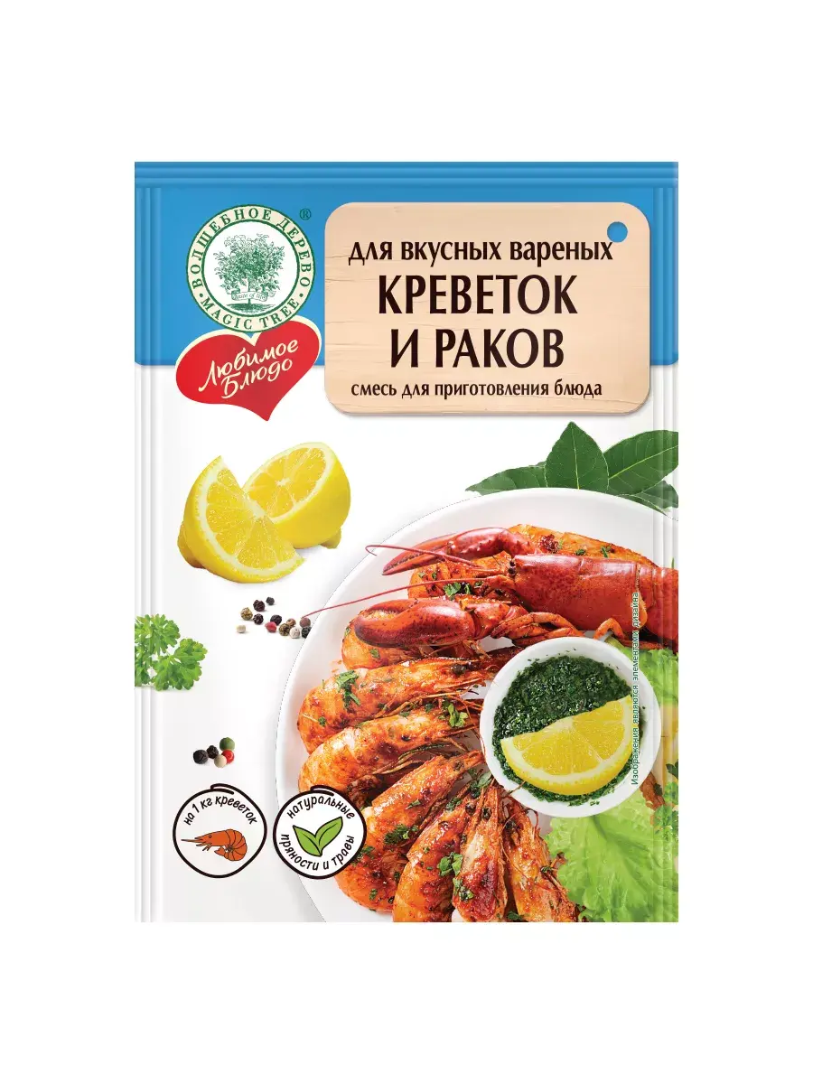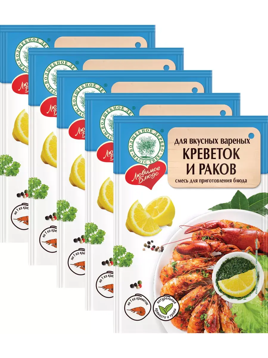 Закуска из вареных морепродуктов получится невероятно вкусной, если при готовке использовать специи: ароматный лавровый лист, семена укропа, пикантный черный перец и пряный кориандр. Чтобы не тратить время на поиски необходимых ингредиентов, предлагаем купить приправу для креветок и раков - это идеально подобранный букет ароматных специй, который придаст блюдам восхитительный, насыщенный вкус. Кориандр и укроп, душистый перец и лавр подарят морепродуктам аппетитный, пряный аромат, а морская соль и острый перец подчеркнут естественный вкус и сделают его более выраженным. Просто добавьте приправу при закипании воды: пакетика хватает на килограмм морепродуктов. В комплекте 5 пакетиков по 55г