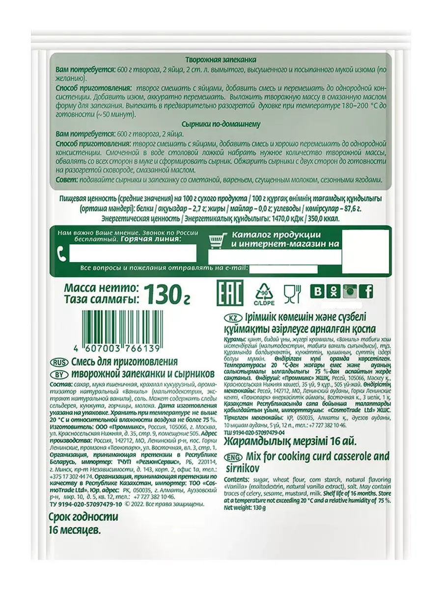 Смесь для приготовления творожной запеканки и сырников — незаменимый помощник для всех воздушных десертов из творога. Для того, чтобы готовые изделия получились нежными, объемными и аппетитными, рекомендуется строго следовать инструкции, представленной на упаковке. Изумительные творожные десерты, приготовленные в домашних условиях, станут прекрасным угощением для ваших родных и близких. В комплекте 4 индивидуальные упаковки по 130 грамм.