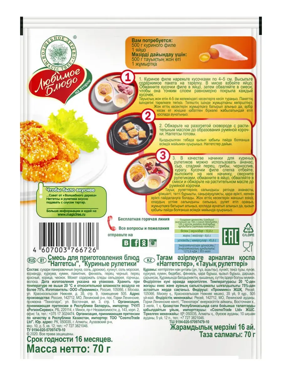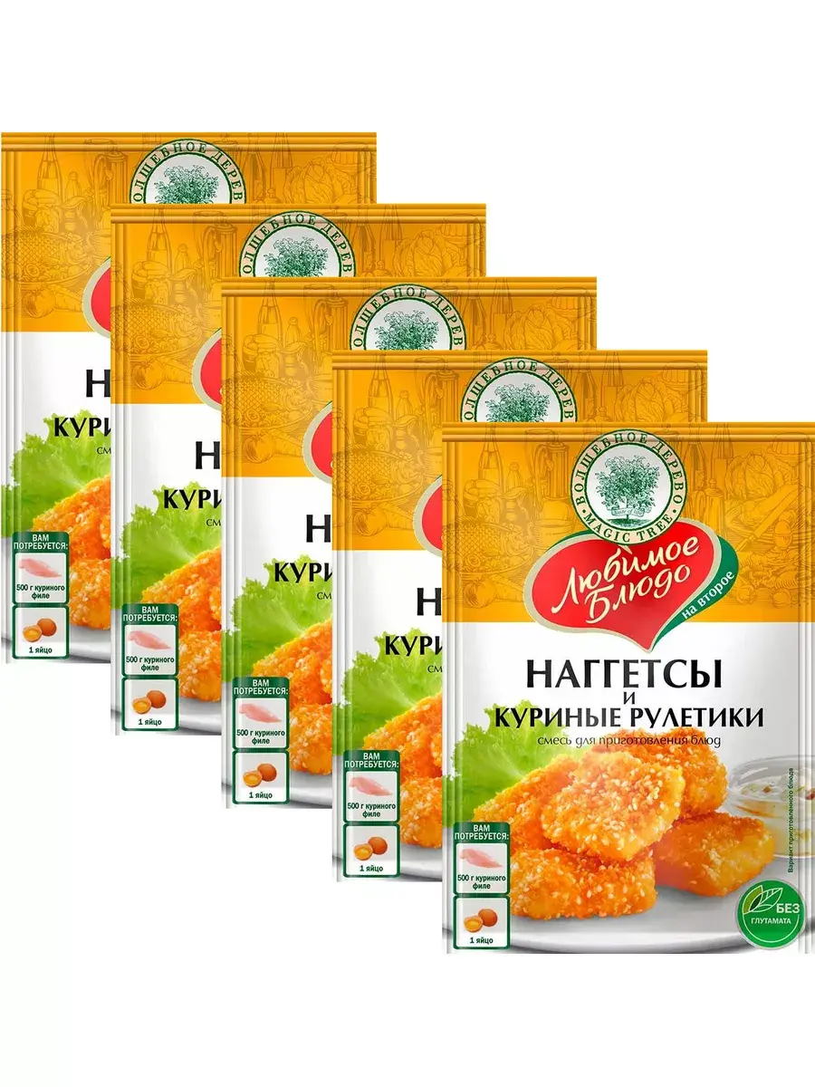 Смесь для приготовления наггетсов и куриных рулетиков поможет приготовить любимые блюда еще более вкусными! Панировочные сухари, кунжут, морская соль, карри, чеснок и черный перец в совокупности подарят не только хрустящую золотистую корочку но и аппетитный вкус и аромат. В комплекте 5 штук по 70г.