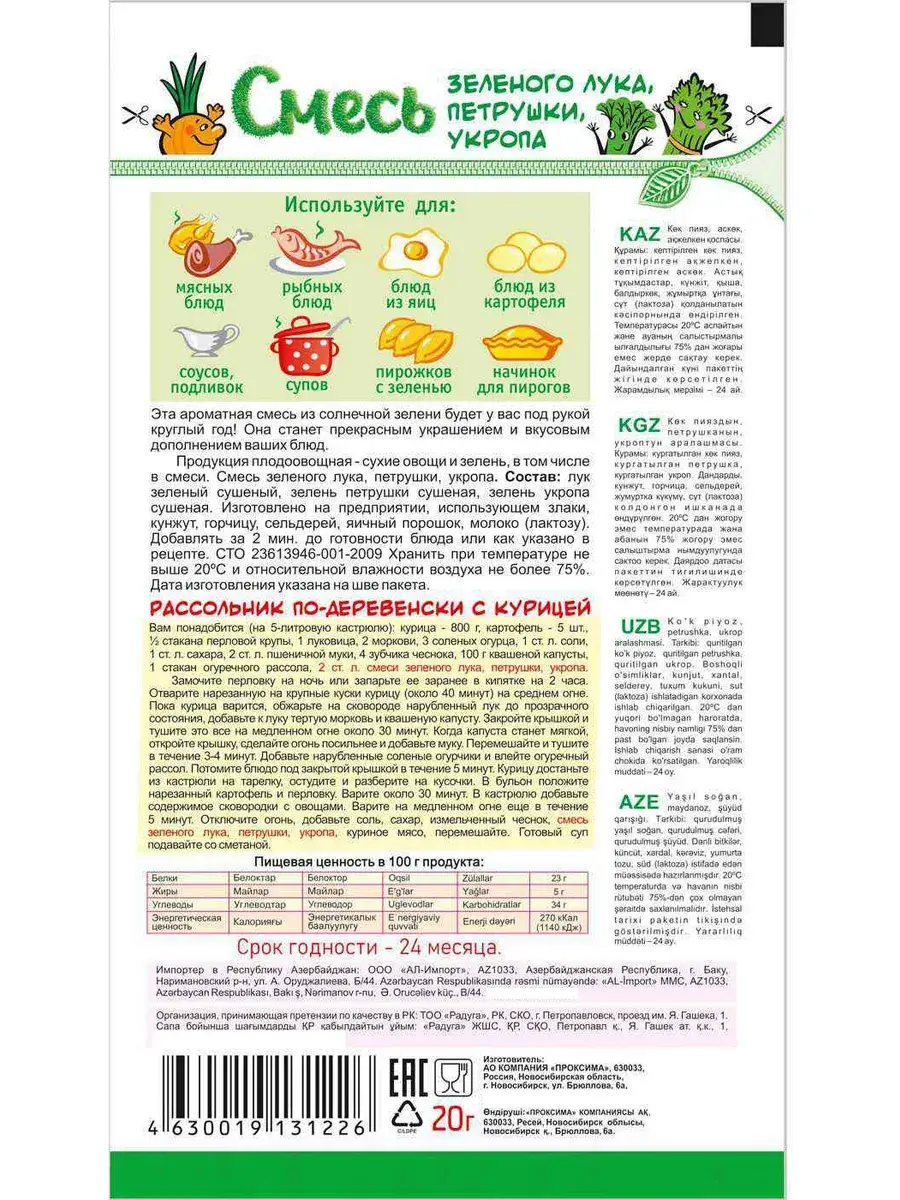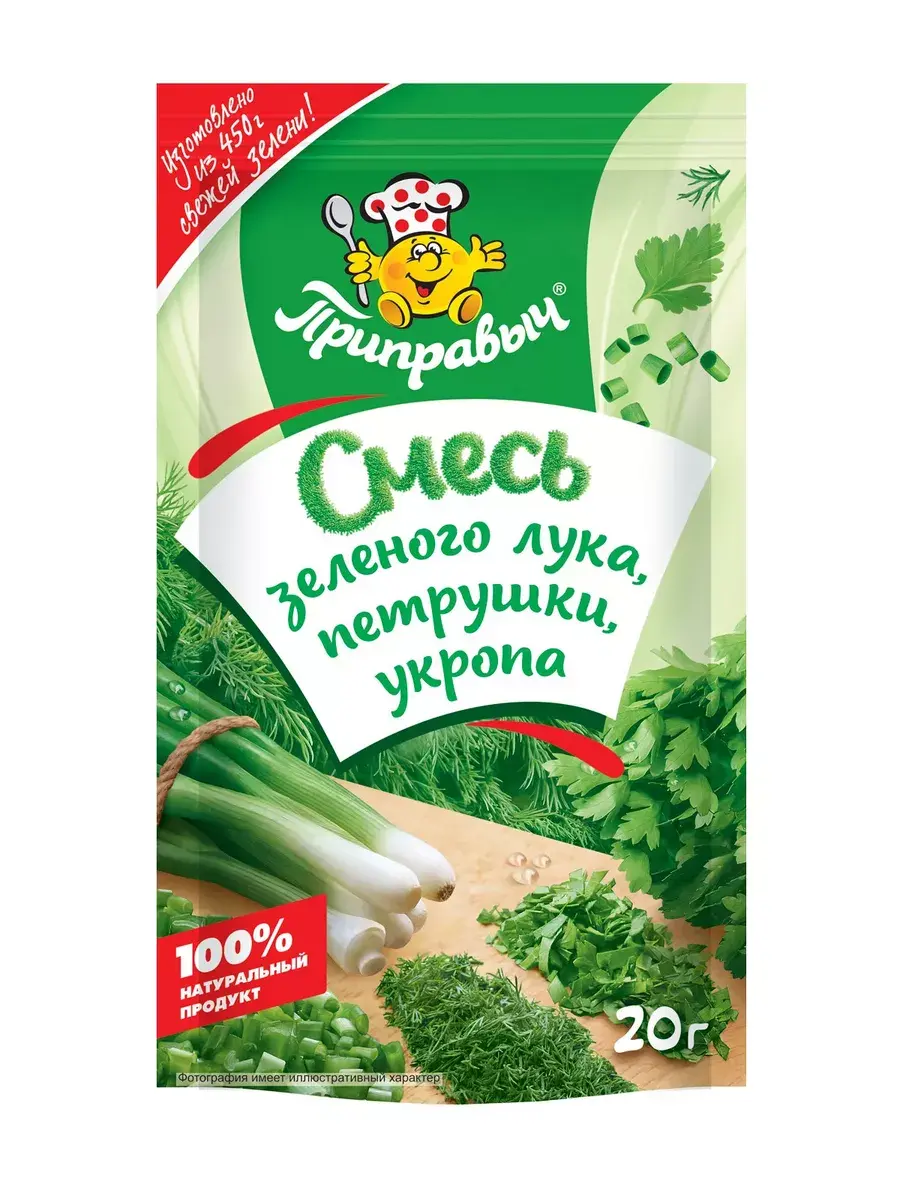 Приправа «Смесь зеленого лука, петрушки, укропа» - это великолепный букет знакомой нам огородной зелени, выращенной под щедрыми лучами солнца! Она станет прекрасным украшением и вкусовым дополнением ваших блюд. Вам останется только высыпать ее из пакетика и палитра вкусов лета окажется у вас на столе, даря блюдам яркие цвета и ароматы лета. Эта приправа из солнечной зелени будет у вас под рукой круглый год! Пропорции из микса зелени также тщательно продуманы для лучшего вкуса ваших блюд. В каких блюдах использовать приправу? Приправа универсальна, ее можно добавлять в любые мясные, рыбные, блюда из яиц, картофеля, также в супы, соусы, подливы, а также в пироги, пирожки с зеленью.