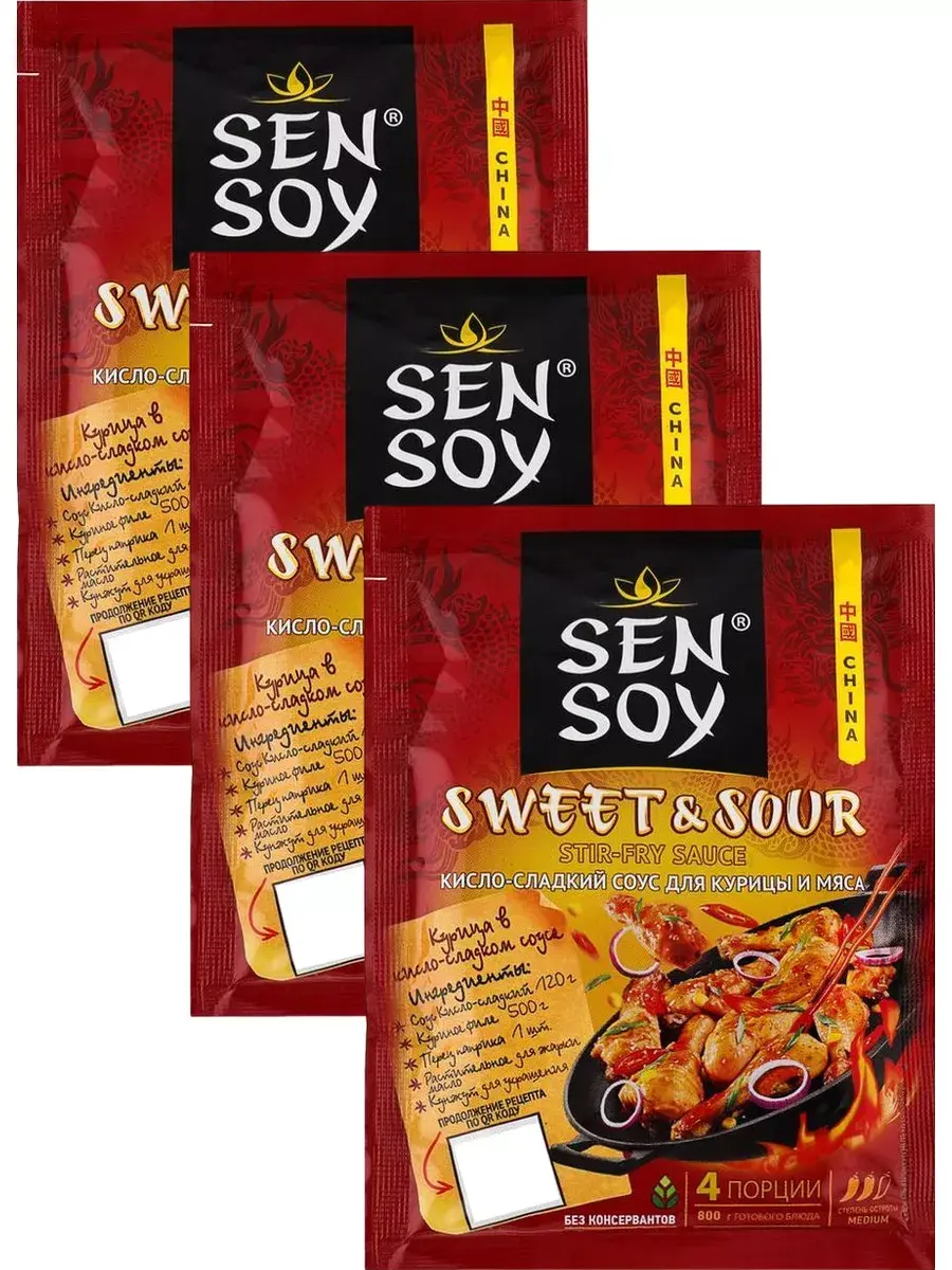Соус Sweet & Sour (Кисло-сладкий) прекрасно подходит для быстрого приготовления мяса и птицы. Мягкий пряный вкус с выраженными фруктовыми нотками, в сочетании с нежной мякотью обжаренного мяса, создает неповторимо яркую вкусовую композицию. С этим соусом можно из самых простых продуктов приготовить изысканное блюдо – аппетитное, ароматное и экзотичное. Достаточно лишь нарезать мясо тонкими полосками, перемешать по желанию с овощами или бобами и выложить на раскаленную сковороду, обильно полив соусом Sweet&Sour. Через несколько минут блюдо готово. В наборе 3 индивидуальные упаковки по 120 грамм.